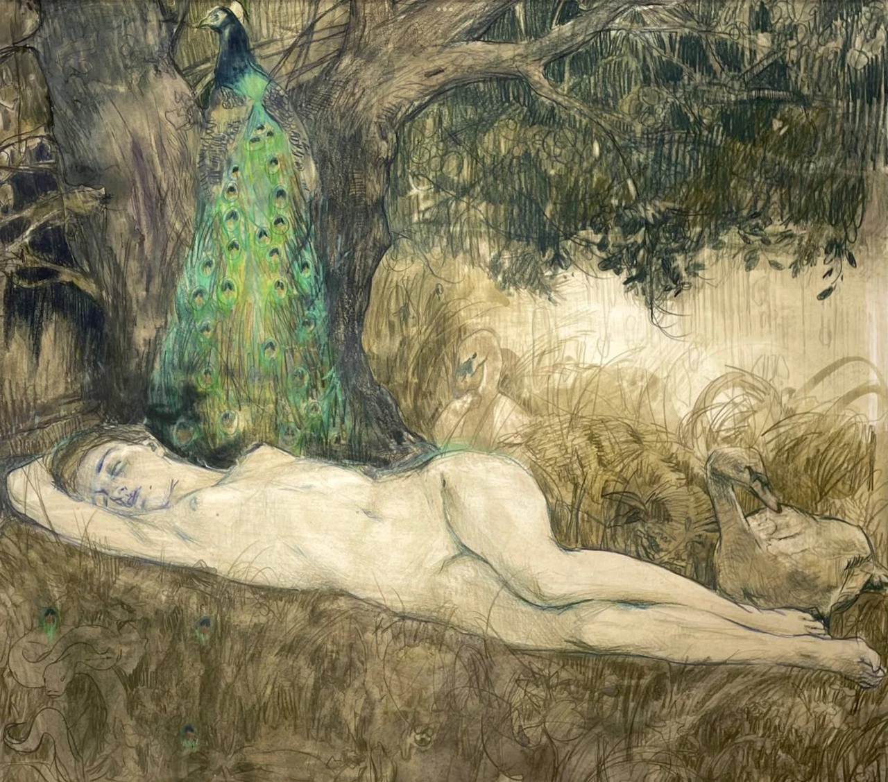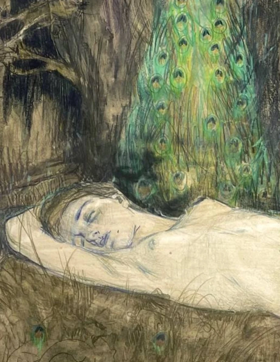 Образ павлина вводит мотив внимательного, почти сакрального взгляда, в то время как мягкая, текучая графическая линия растворяет границы между телом и средой. Работа фиксирует сад не как утраченный миф, а как хрупкое состояние равновесия, которое ещё возможно удержать через заботу, наблюдение и медленное со-присутствие.