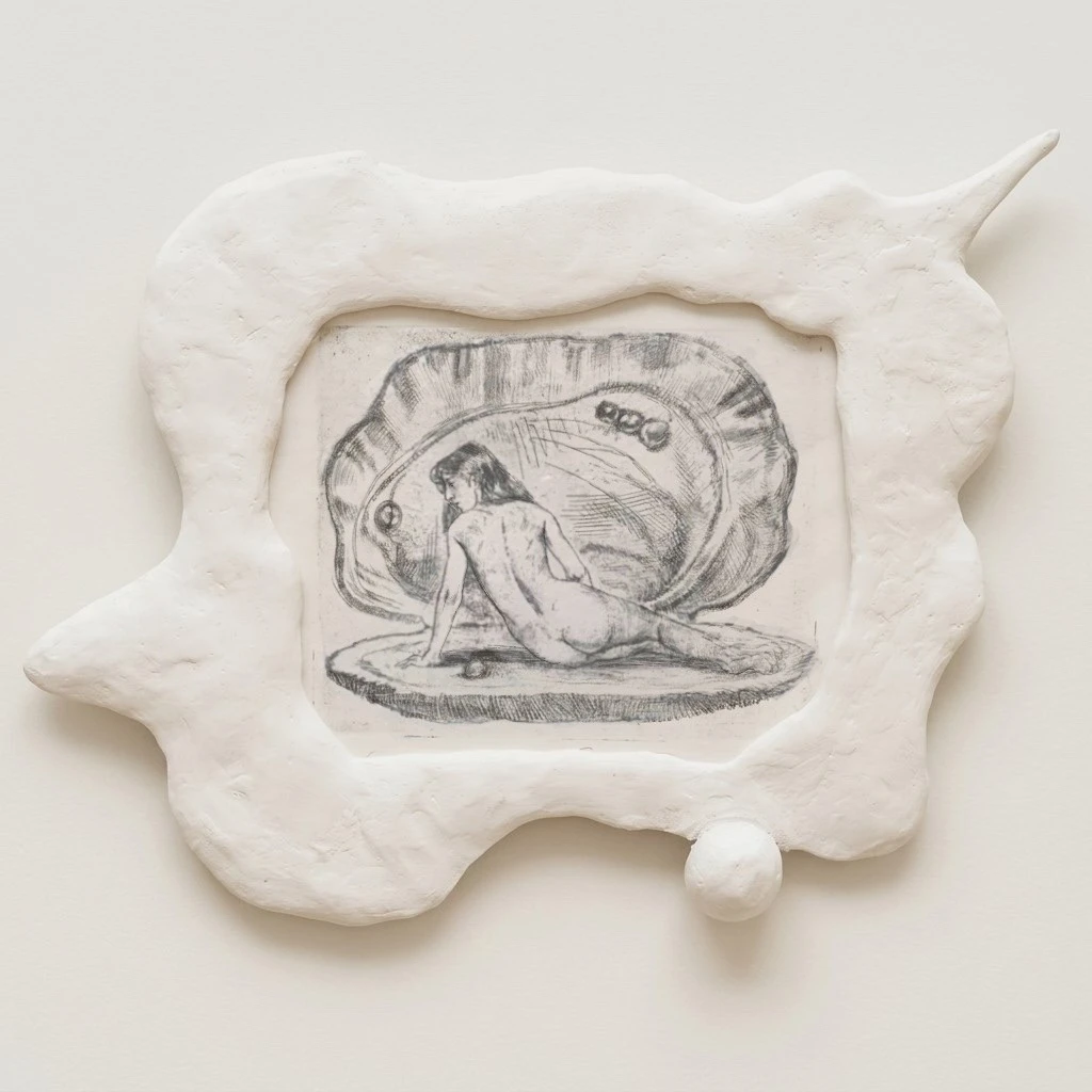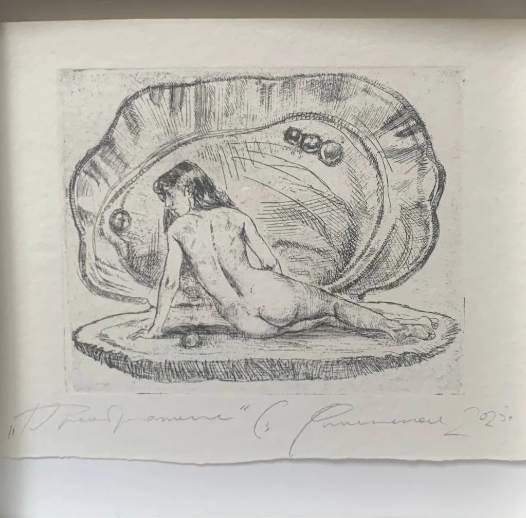 Офорт (гравюра на металле) из серии о «жемчужинах», рама сделана в ручную специально для этой работы. И сейчас эта работает как переходное звено между объектом и графикой.