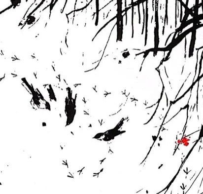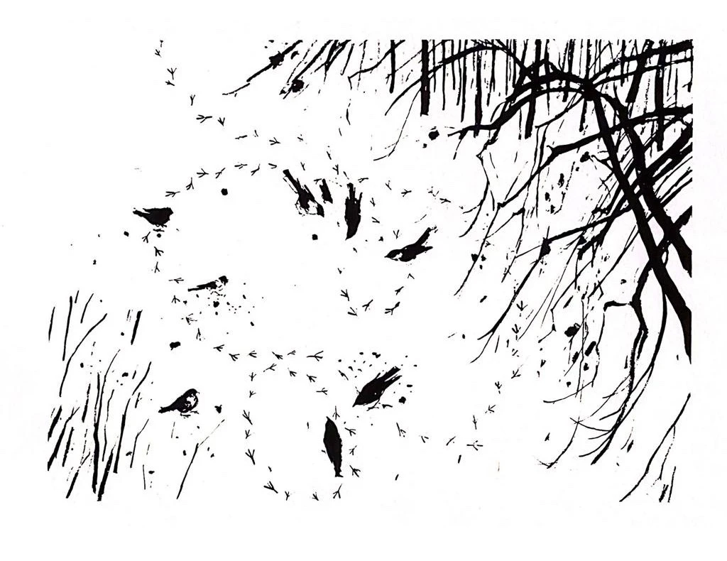 Мне всегда нравилось наблюдать за следами на снегу. Иногда ты фантазируешь, а кто это прошел и куда же держал путь. С животными проще — мы отчетливо отличаем их следы от своих. В этой же работе следы задают дополнительную мыслительную динамику — можно наблюдать как за самими птицами, так и за тем, как они ходили по лесной опушке в поисках зернышек под снегом.
