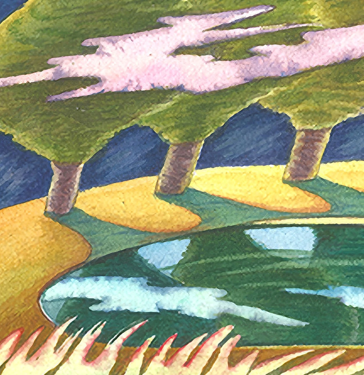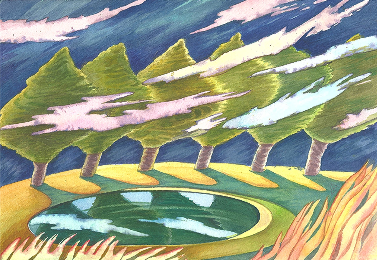 Центр композиции — озеро, будто вырезанное из зелёного стекла, отражающее небо и деревья. Его поверхность — как зеркало, в котором всё перевёрнуто: облака становятся водой, а деревья — тенями. Озеро — окно в другой мир, где реальность и отражение сливаются воедино. Это мир, где формы не статичны — они пульсируют, дышат, меняются.