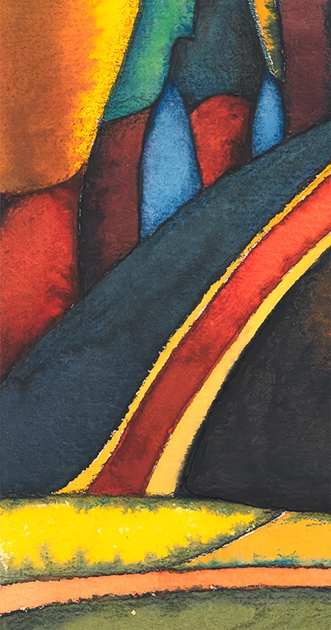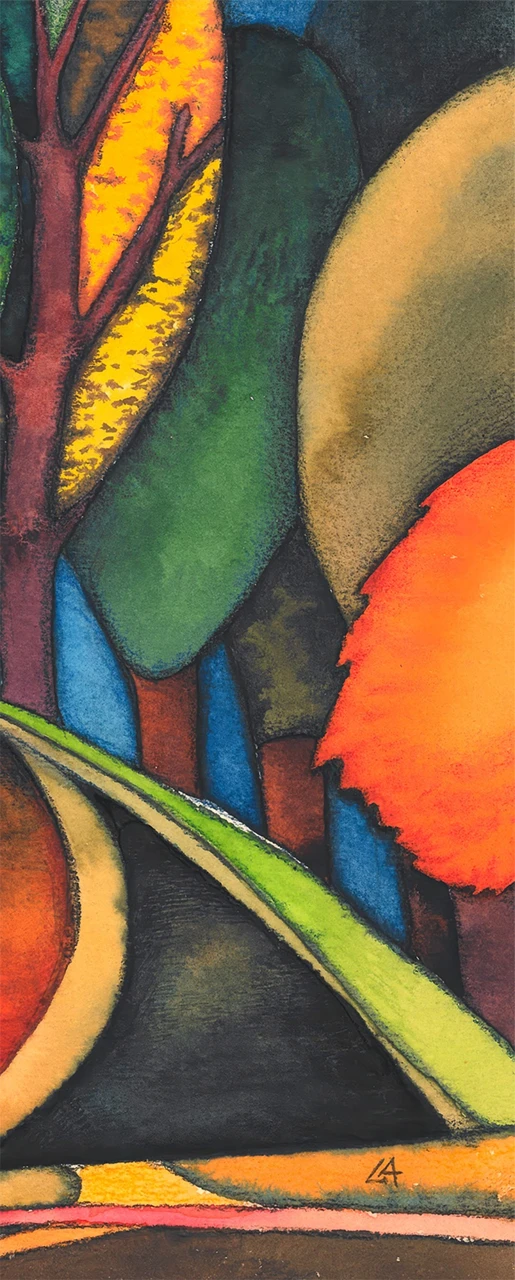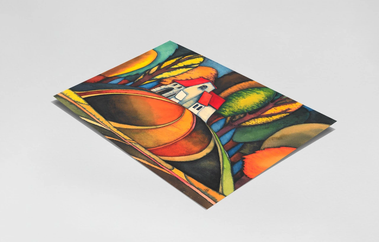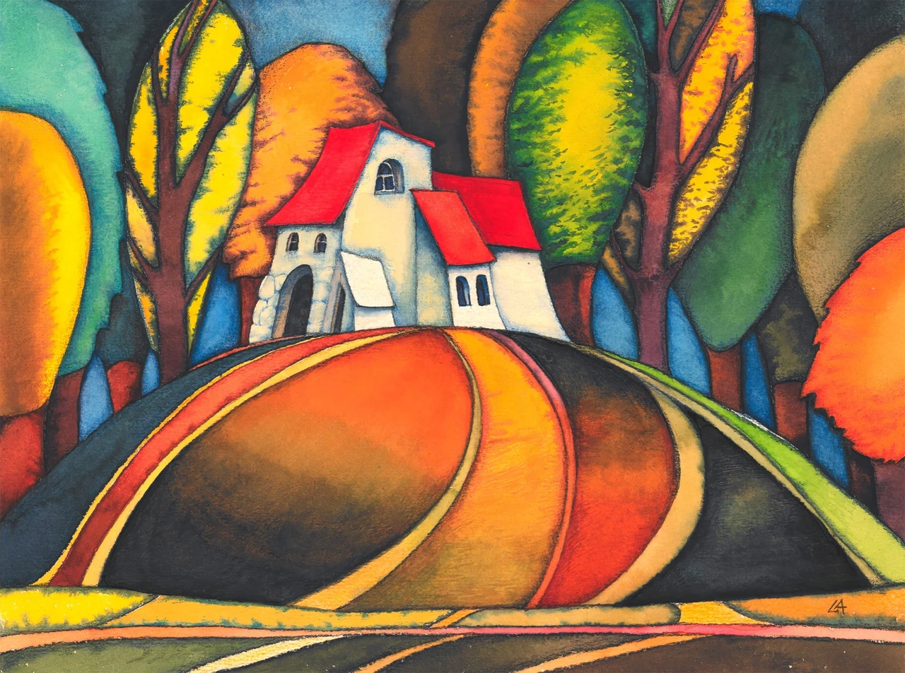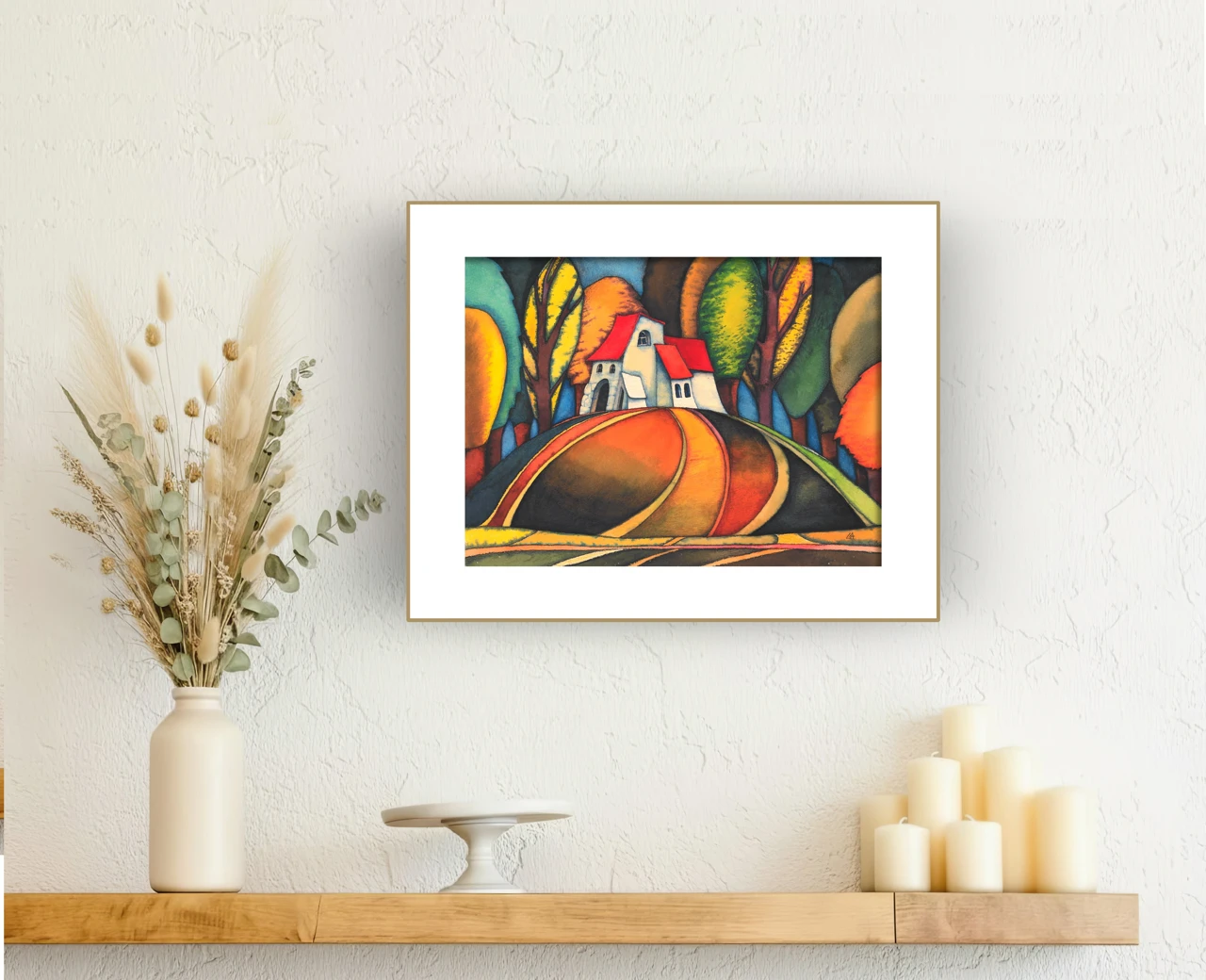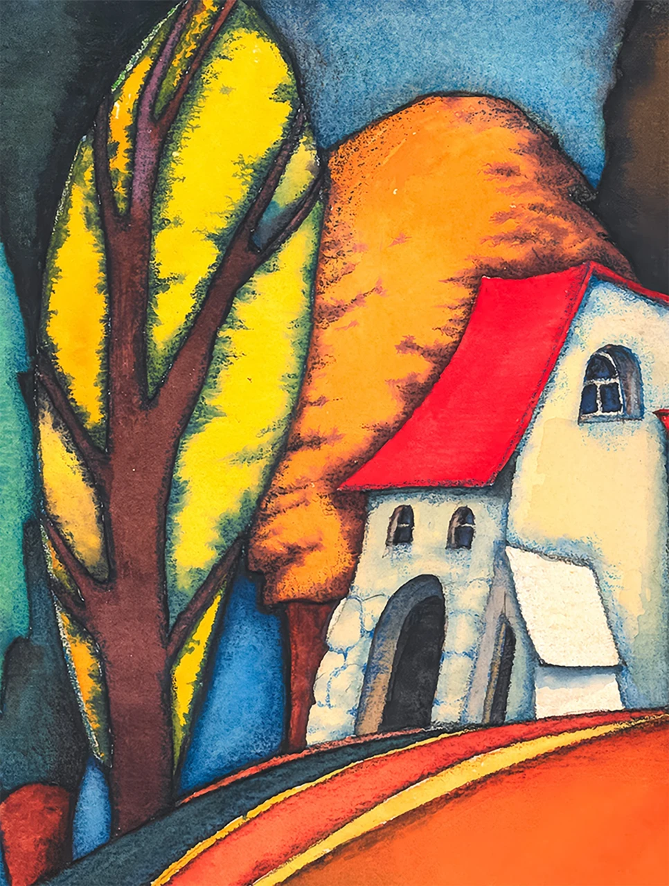 Работа «Приют путника» — это авторская графика, выполненная в уникальной стилистике, сочетающей элементы экспрессионизма и декоративного примитивизма. В центре композиции расположено белокаменное здание с ярко-красной крышей, возвышающееся на холме. Окружающий ландшафт решен через ритмичное чередование стилизованных деревьев и плавных линий рельефа. Насыщенная палитра, построенная на контрасте теплых охристых, оранжевых тонов и глубоких сине-зеленых оттенков, создает атмосферу уюта и защищенности, полностью раскрывая название сюжета. Техника исполнения сочетает мягкость акварельных заливок и четкость контуров, проработанных пастельным карандашом. Это придает изображению особую осязаемость и глубину, подчеркивая многослойность пространства. Современное искусство в таком исполнении отличается гармоничной палитрой и выверенным композиционным равновесием. Данная авторская работа станет выразительным арт-объектом для интерьера или дополнит частную коллекцию современного искусства.
