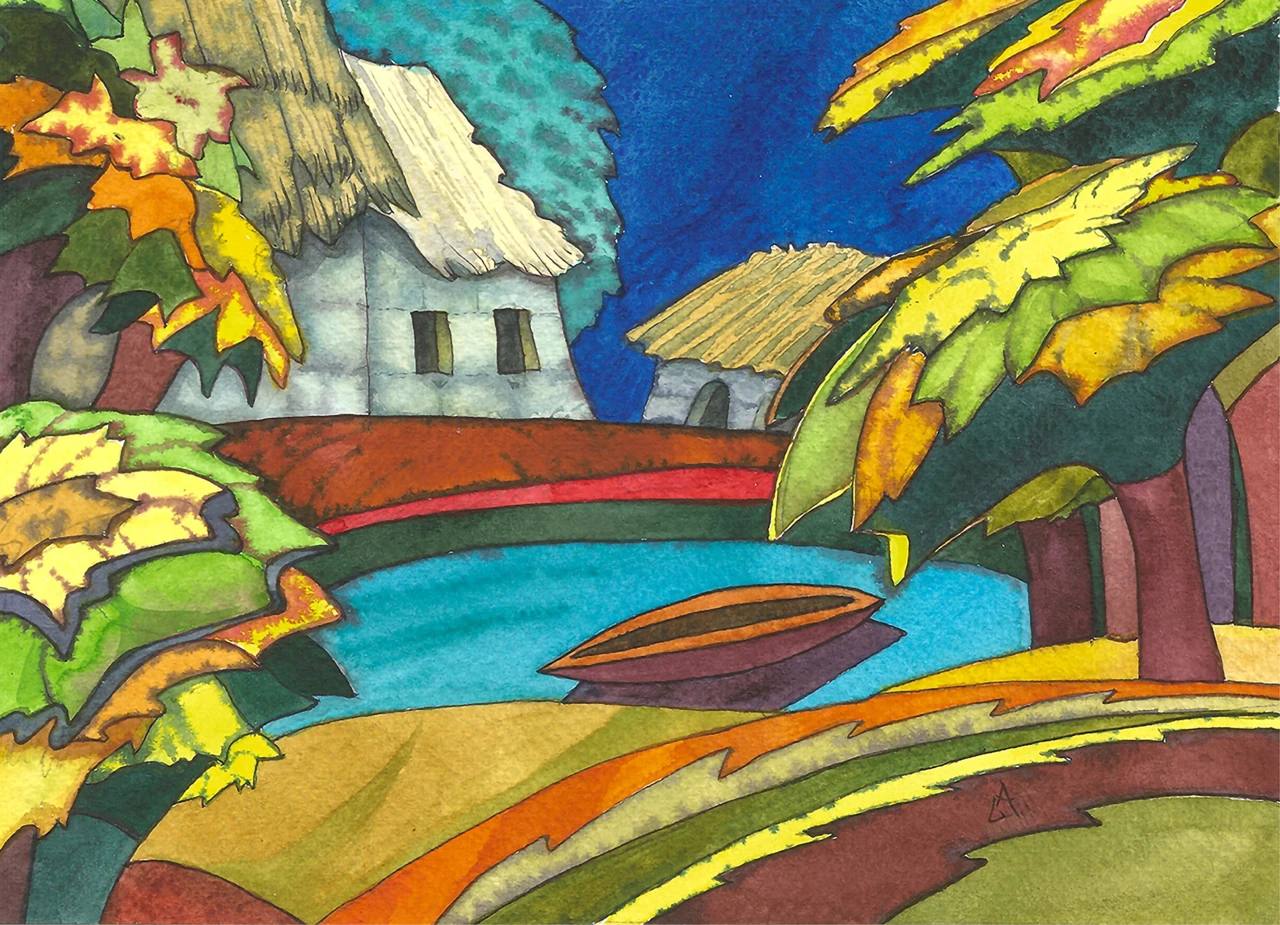 Здесь нет стремления к реалистичности — есть желание передать радость бытия: как свет играет на листьях, вода кажется живой, даже самый простой домик становится местом, куда хочется вернуться. Работа будто говорит: «Посмотри — мир может быть ярче».