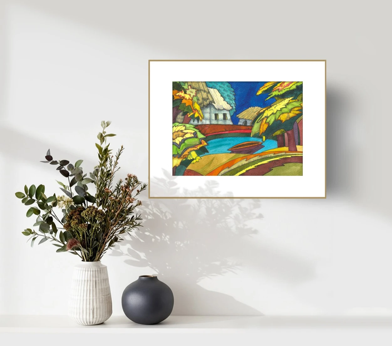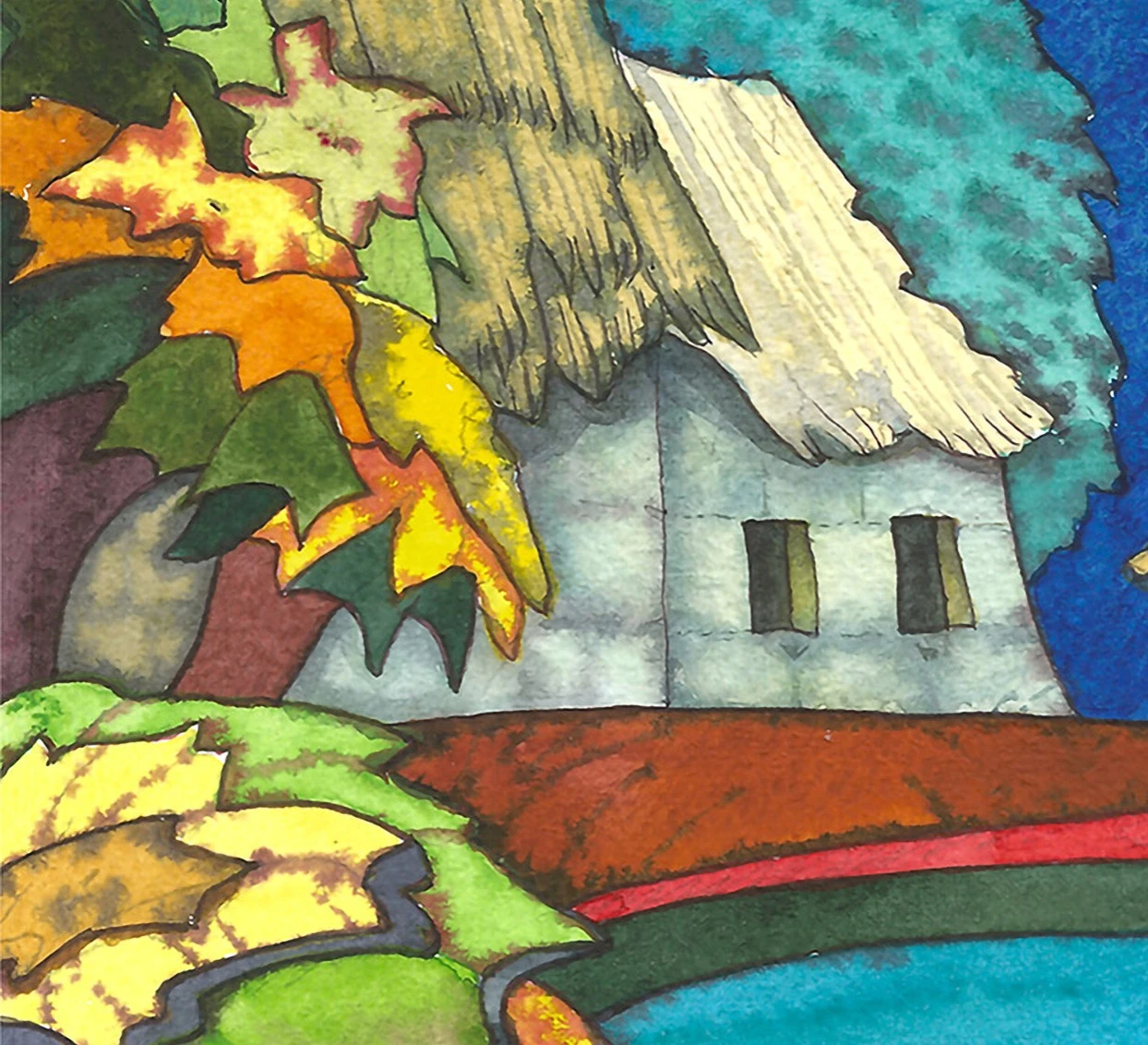 Яркая, почти сказочная акварель из серии «Счастливые домики». Дома с соломенными крышами прячутся за деревьями с золотыми листьями, а река, словно вырезанная из бирюзы, отражает небо. Контурные линии и насыщенные плоскости цвета создают ощущение детской книжки — тёплой, доброй и немного фантазийной. Это не пейзаж, а праздник осени, написанный с улыбкой.