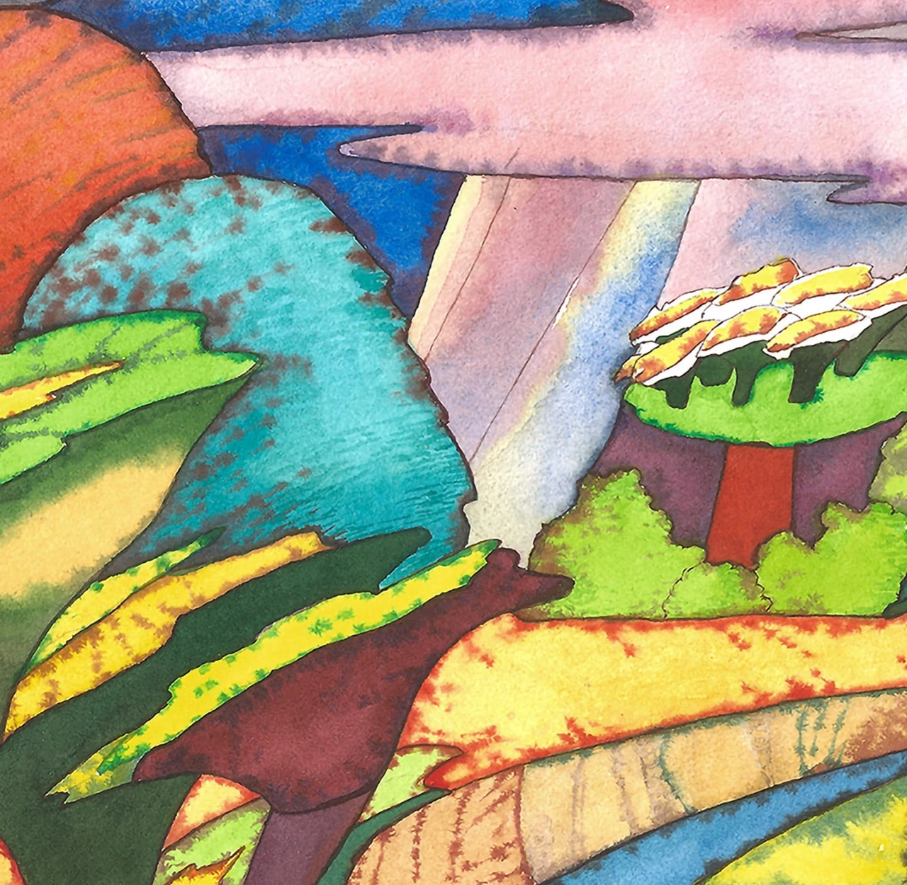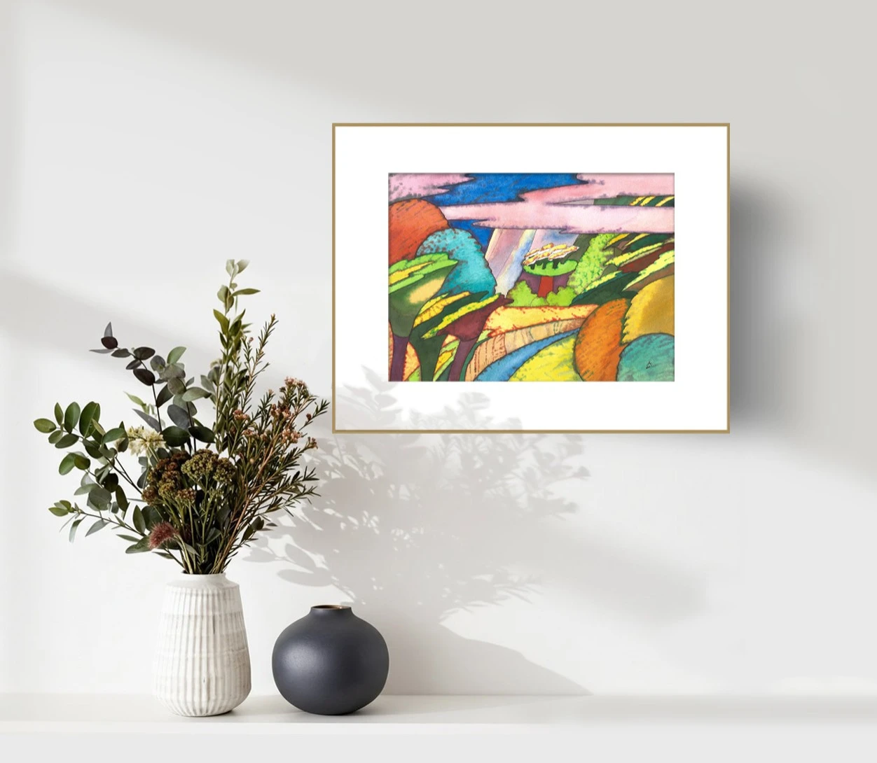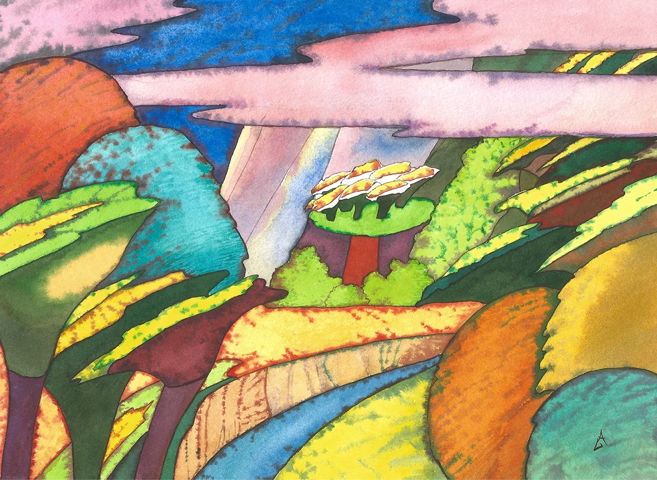 Цветовая гамма в этой работе из серии «Счастливые домики», особенно живая: от глубокого синего оттенка неба до сочного зелёного и жёлтого листвы. Каждый оттенок — как кусочек мозаики, сложенный в единое целое. Деревья с округлыми кронами — как облака, застывшие над землёй. Небо, вырезанное из синего и розового стекла, окутывает холмы, деревья и реку, создавая ощущение уюта и покоя. Каждый оттенок — как нота в музыке природы, где голубое небо — аккорд, объединяющий всё воедино. Чёрные контуры будто рамки, фиксирующие момент, но не ограничивающие пространство.