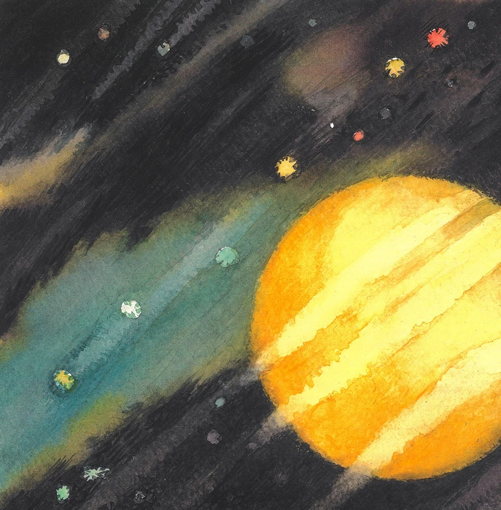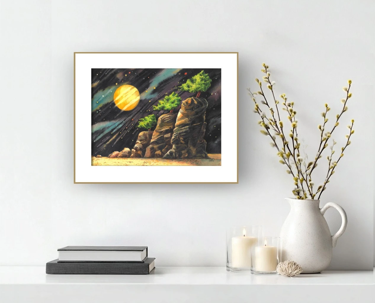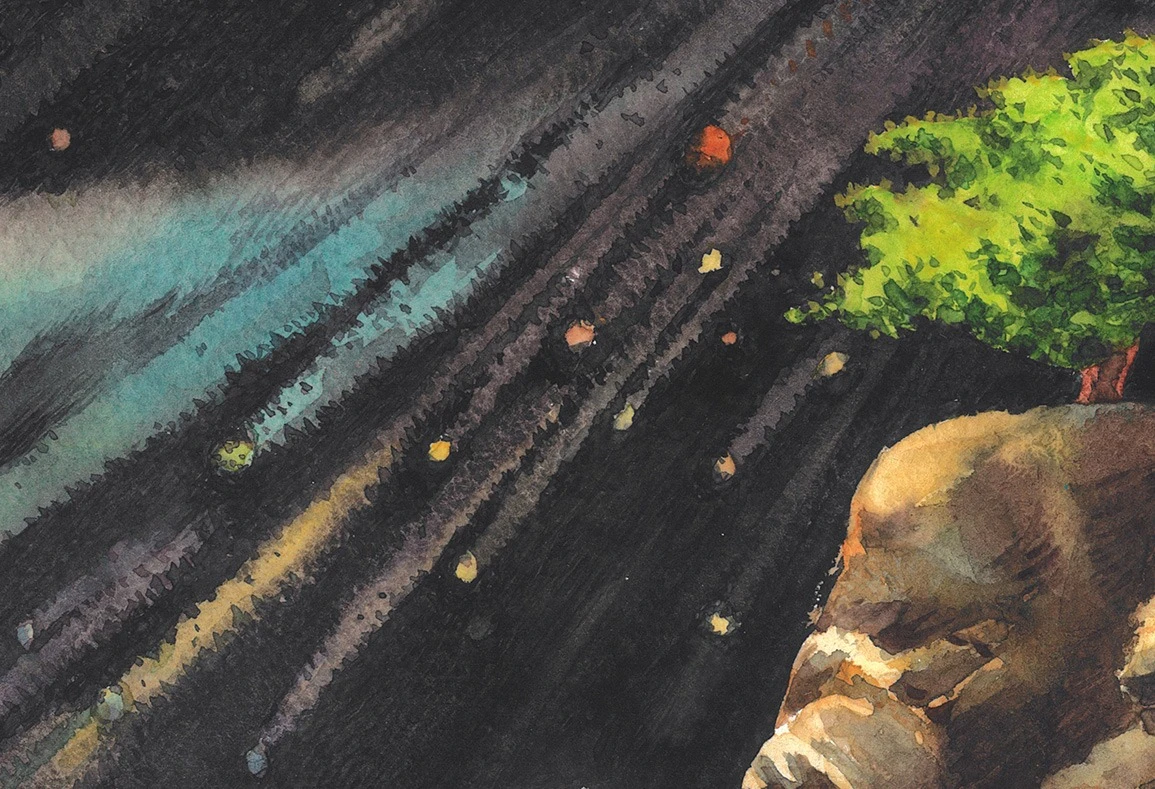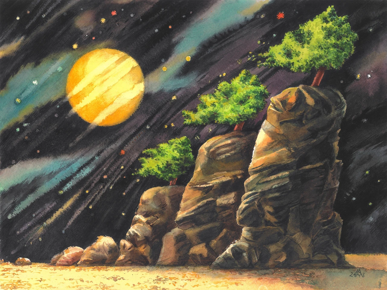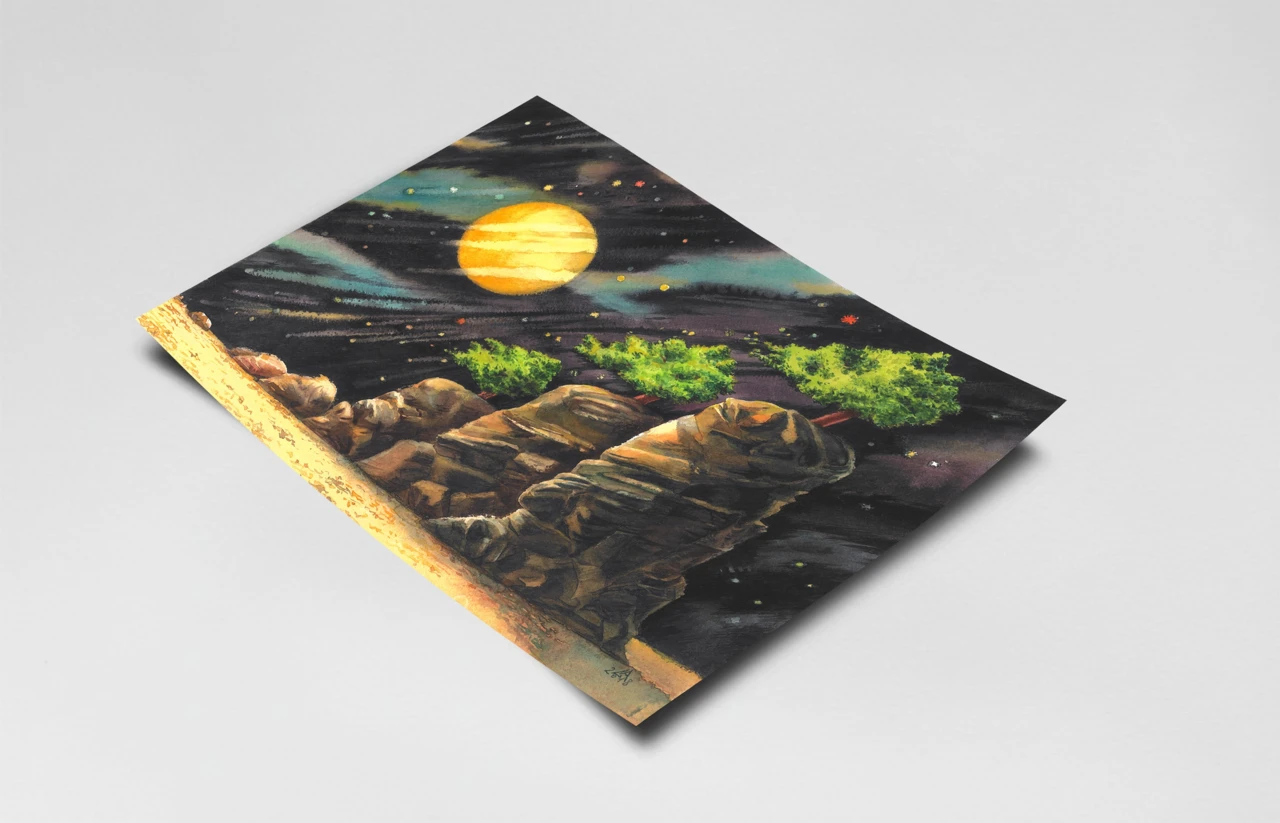 Работа "Звездопад" — это авторская графика, выполненная акварелью на бумаге. Композиция изображает сюрреалистический пейзаж, где скалистые образования с растущими на них деревьями контрастируют с темным ночным небом, усыпанным звездами и освещенным большим желтым лунным диском. Гигантские, изрезанные скалы, словно древние статуи, возвышаются из песчаной равнины, а на их вершинах — зелёные деревья, выросшие из камня, как надежда. Они выживают, свидетельствуя о жизни там, где её нет. Над ними — ночное небо, написанное динамичными мазками: чёрные и синие полосы, как следы комет, пересекающие пространство, усыпанное звёздами-точками и разноцветными бликами — жёлтыми, красными, белыми. Эффект "звездопада" передан через диагональные линии и россыпь мелких цветных точек, создавая ощущение движения и космической глубины. Текстура скал проработана с помощью игры света и тени, подчеркивая их объем и фактуру, в то время как яркая зелень деревьев привносит элемент жизни в этот фантастический мир. Художник играет с масштабом и контрастом: громоздкие, тяжёлые скалы против лёгких, почти невесомых деревьев; тёмная глубина неба против тёплого золота луны и зелени листвы. Работа "Звездопад" гармонично сочетает элементы природы и космоса, создавая завораживающую атмосферу. Использование акварели придает изображению легкость и прозрачность, а тщательно подобранная палитра — от глубоких темных тонов неба до теплых оттенков скал и яркой зелени — усиливает эмоциональное воздействие. Это работа о стойкости, тишине и внутреннем свете. Она говорит: даже на краю мира, где земля обнажена, где небо тревожно, — жизнь находит путь. И свет, пусть и далёкий, всегда есть.