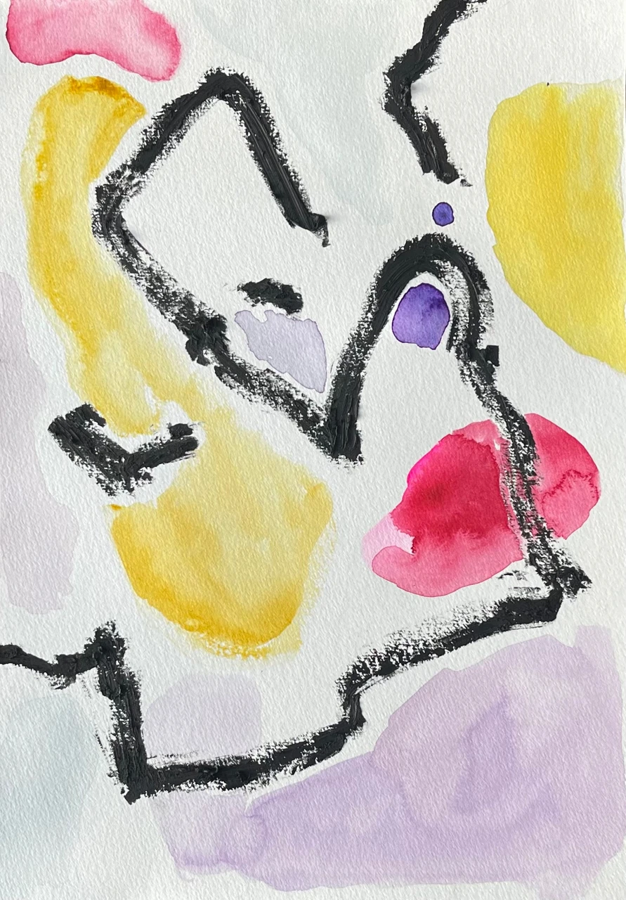 Из серии графических работ "Про пятна и линии". Мне было интересно, как грубые, ломанные линии, выполненные масляными стиками, взаимодействуют с мягкими, плавными пятнами акварели. Мы движемся по этим работам, словно во сне: цепляемся за знакомые четкие образы, которые окружены неясной туманной атмосферой