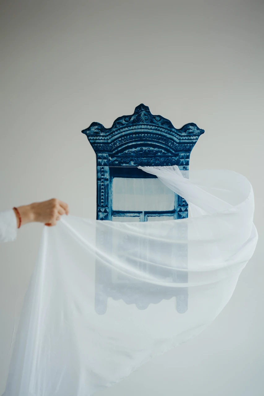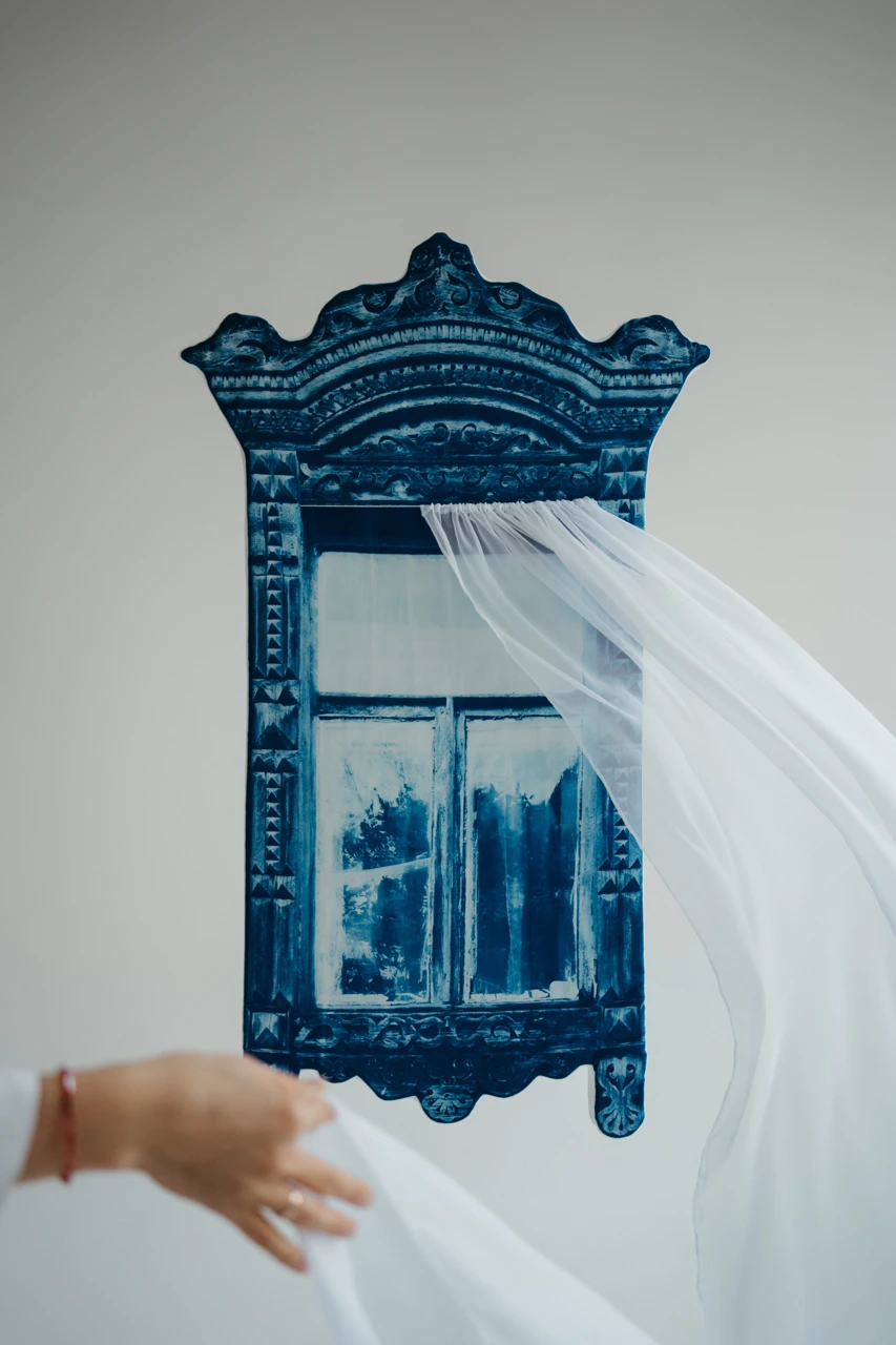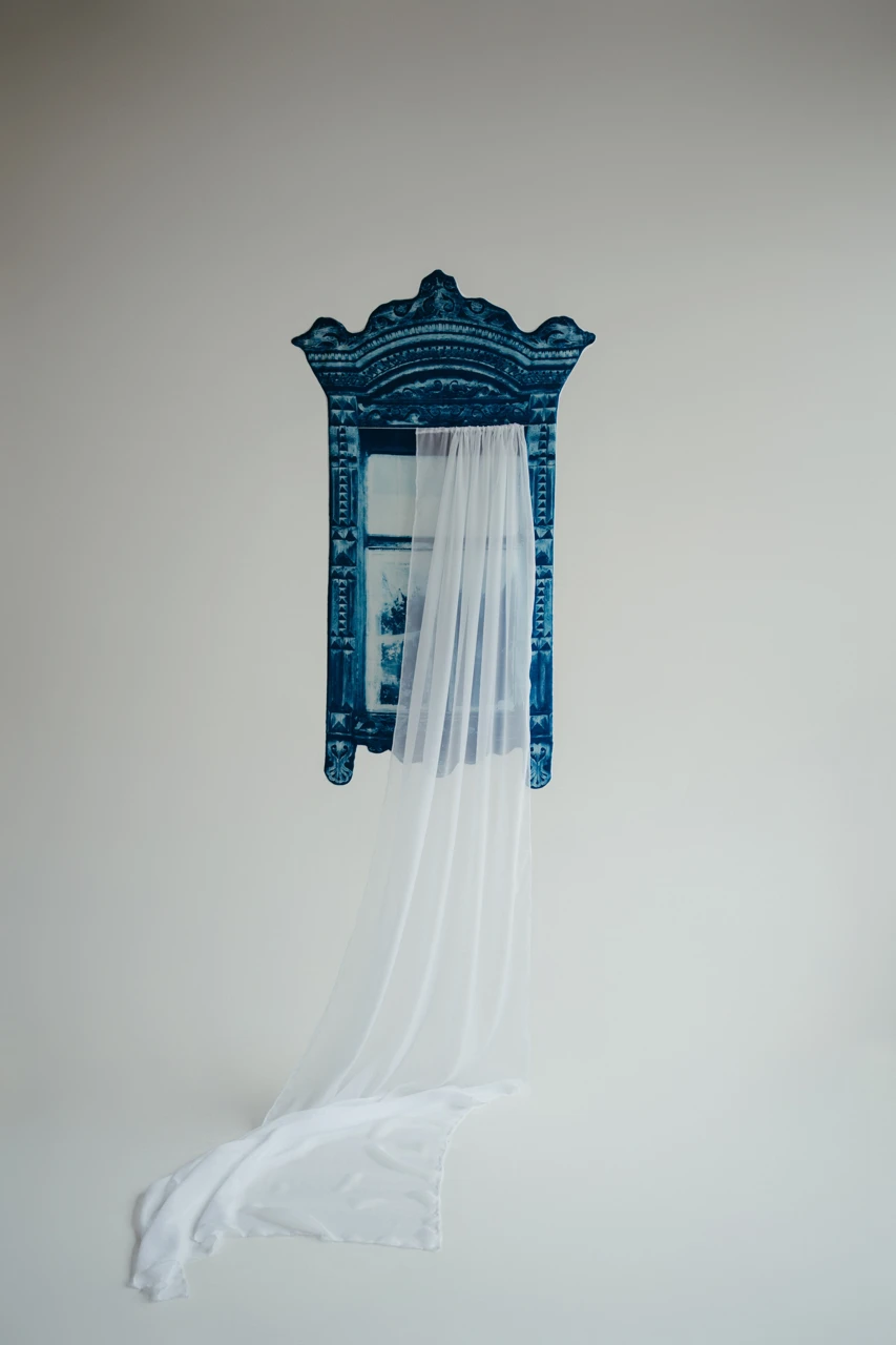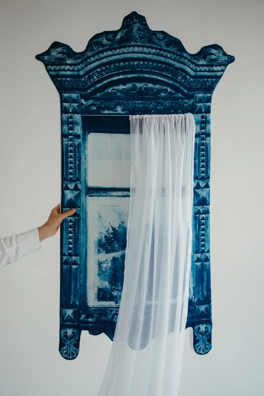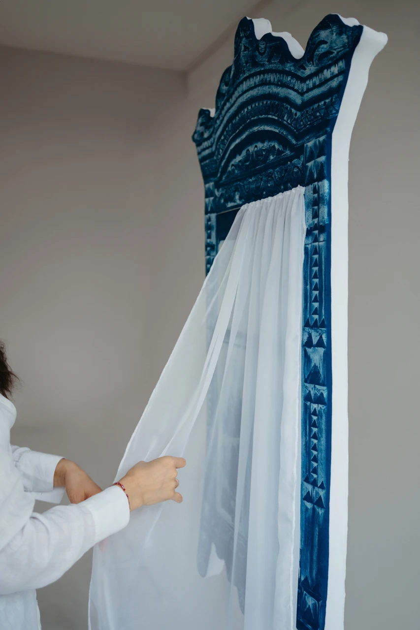 Работа сделана в рамках проекта "Ткань памяти". Проект предлагает переосмыслить тему дома через художественное выражение. Основой являются текстильные арт-объекты, вдохновленные наличниками и венками — элементами русской культуры, связанными с культурными практиками и ритуалами, играющими ключевую роль в формировании идентичности и семейных ценностей. В работе автор обращается к наличнику, потому что помимо защитных функций, он олицетворяет дом как вместилище грез. Через воздушный элемент — шторы — автор передает неосязаемость воспоминаний, хранящихся в доме.