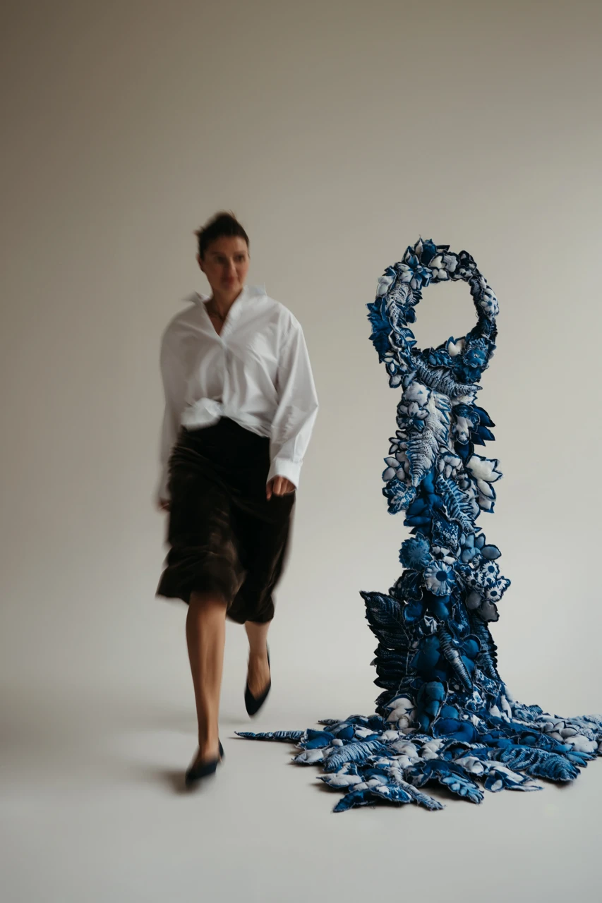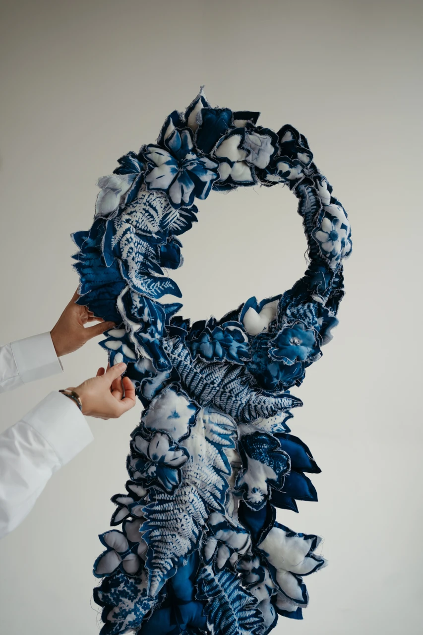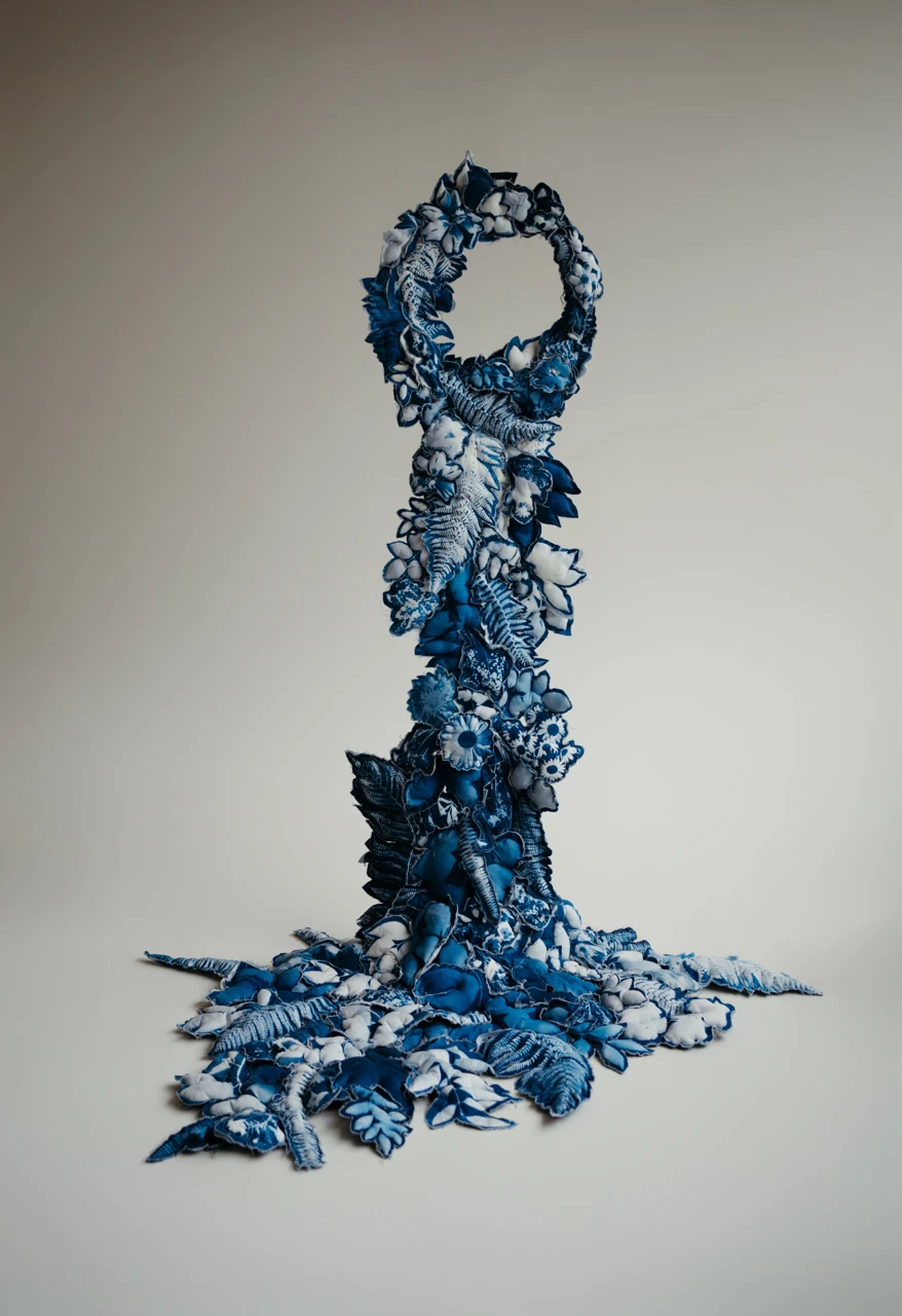 Работа сделана в рамках проекта "Ткань памяти". В текстильной скульптуре, созданной из вторичного материала методом цианотипии, критически осмысляются фольклор и мифология. Это попытка найти смысл в мире, где традиционные практики и ритуалы уступили место новым отношениям человека со средой.