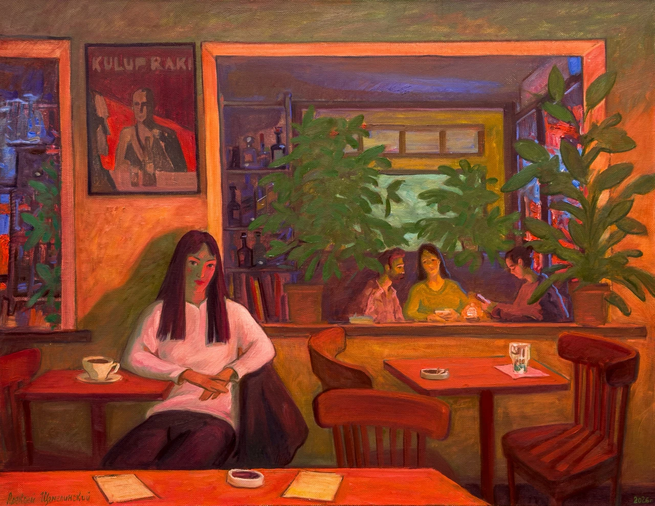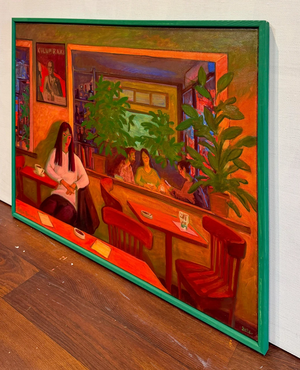Работа основана на наблюдении повседневной сцены, в которой частное пространство кафе становится местом сосуществования разных состояний — одиночества, диалога и внутреннего присутствия. Интерьер выстроен как многослойная среда, где фигуры включены в общий ритм света, цвета и архитектурных элементов.