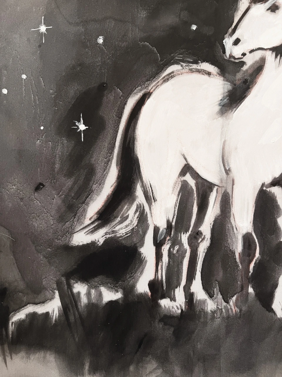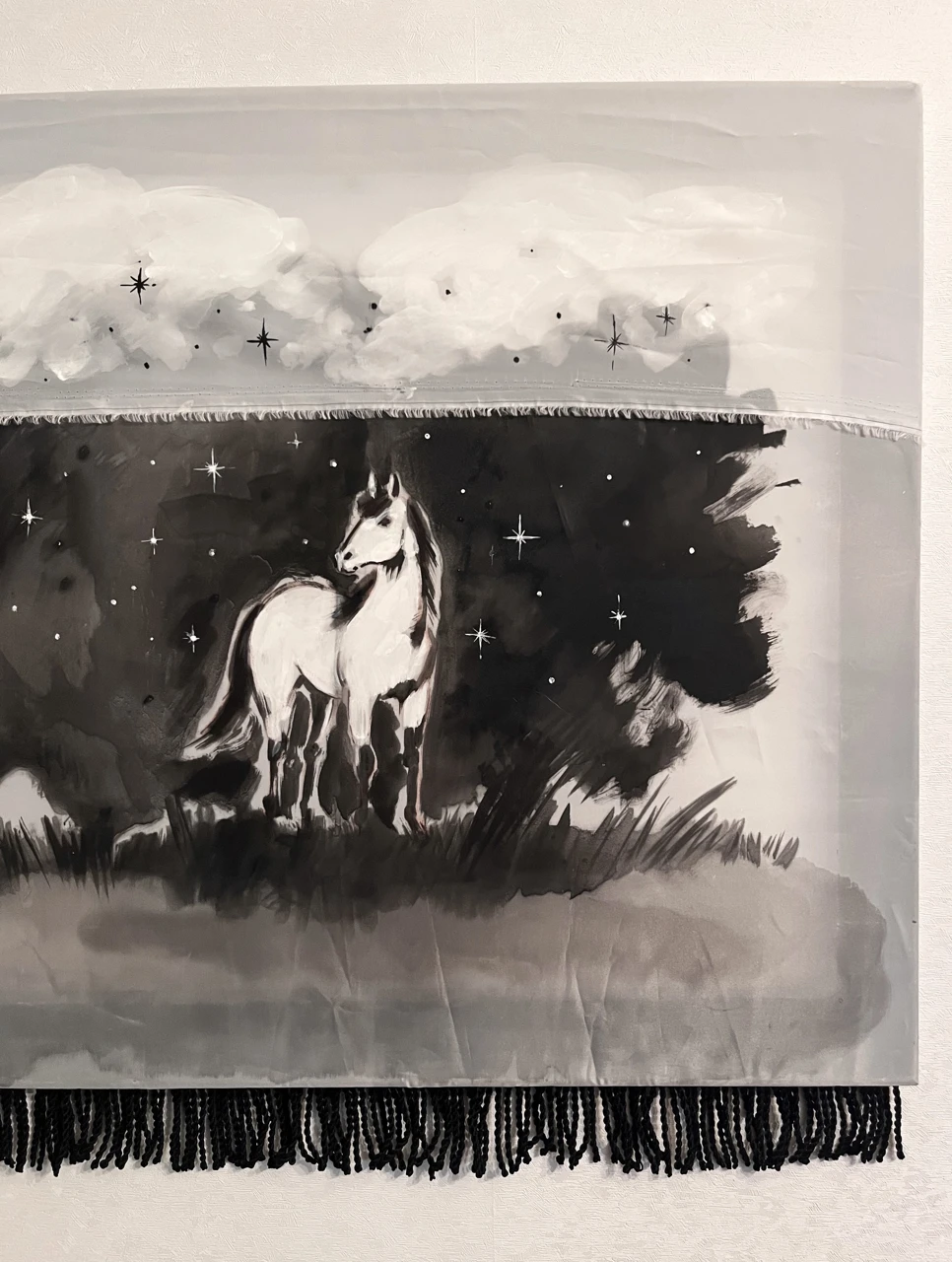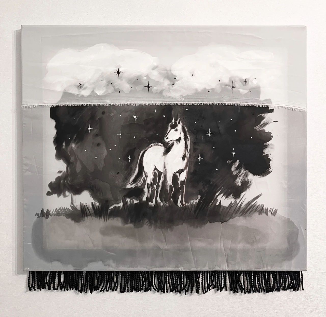 Белая лошадь проявляется в тёмном поле звёзд и облаков, как фрагмент сновидения. Полупрозрачная ткань делает образ нестабильным и ускользающим. Чёрный подрамник и бахрома фиксируют это видение, удерживая его на границе между образом и объектом.