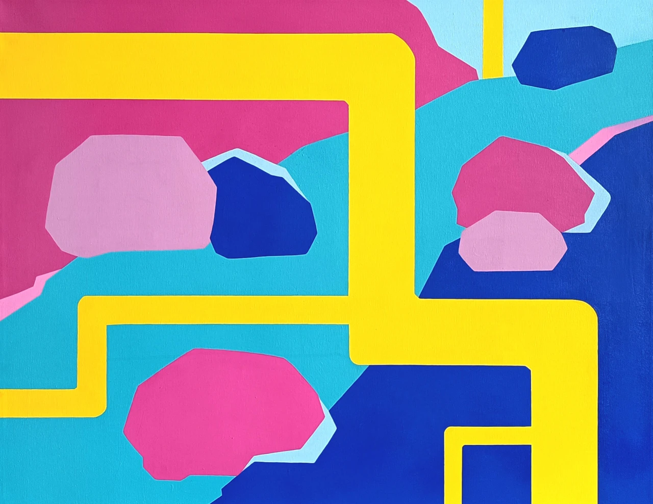 Работа изображает связь природных и антропогенных объектов. Они не противопоставляются друг другу, а соседствуют и взаимодействуют, переплетаются. Вездесущая система желтых труб и реки, камни, горы.