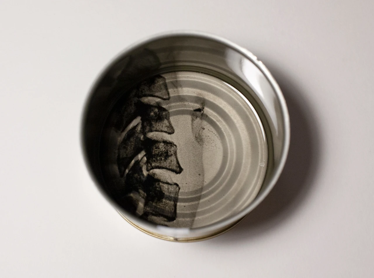 Проект состоит из 90 консервных банок с отпечатками фрагментов моего рентгена на дне, залитыми эпоксидной смолой. Диаметр каждой банки — 83,4 мм, высота — 57 мм.