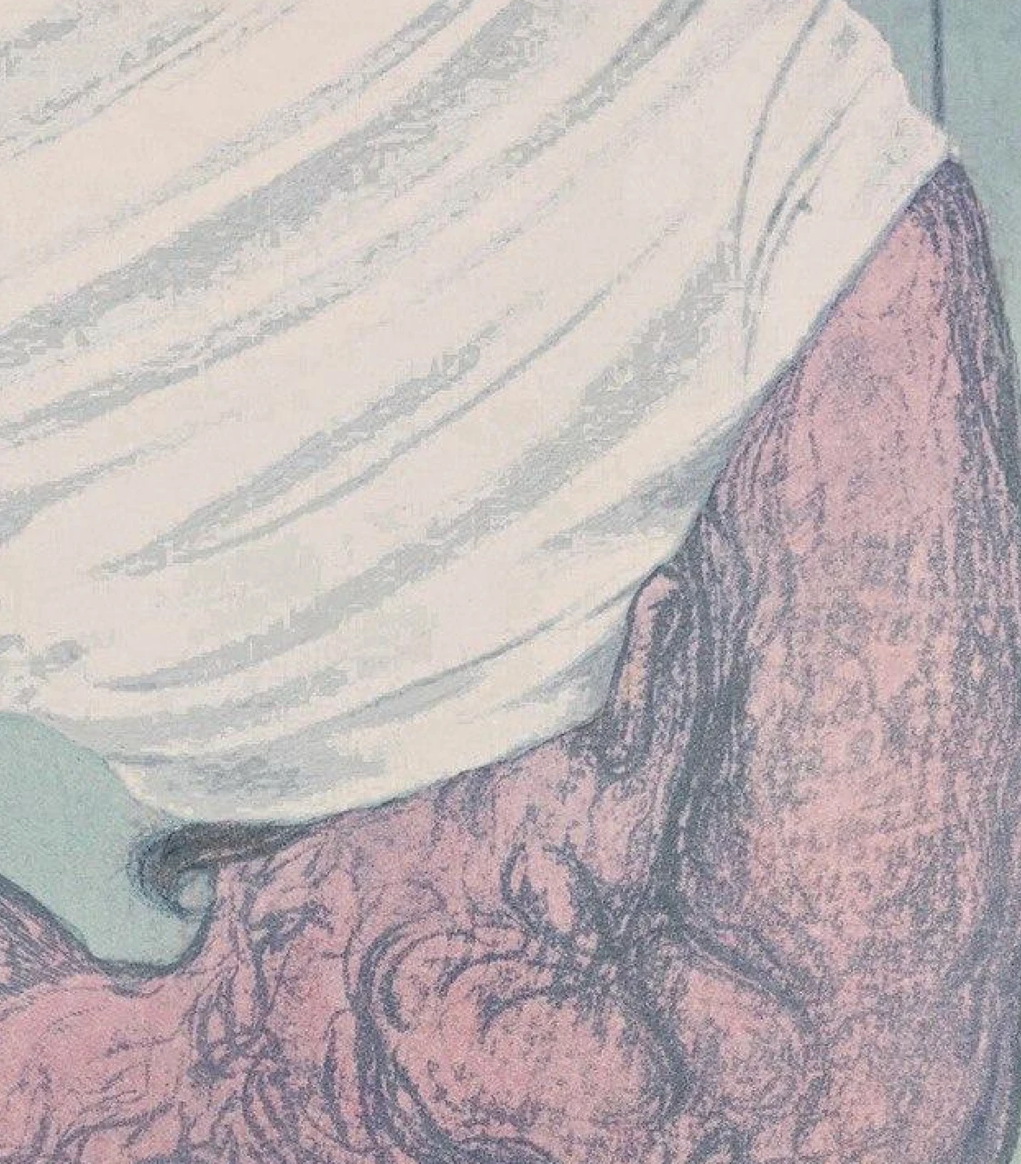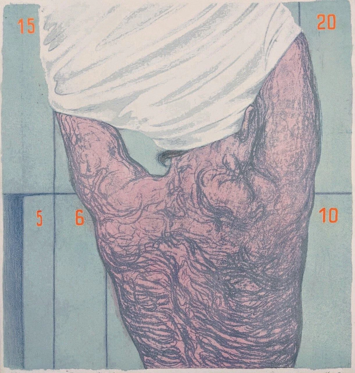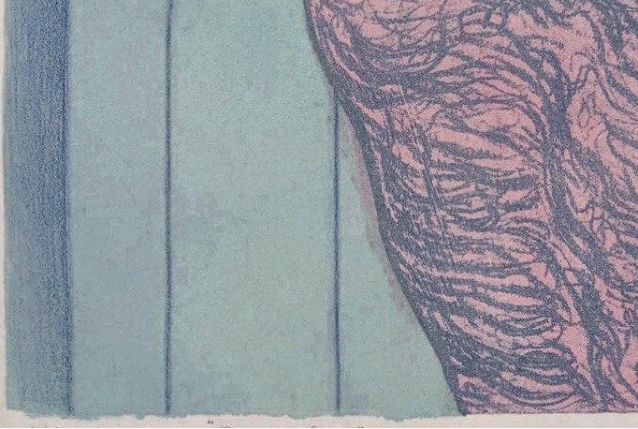 Работа "В раздевалке" — это авторская литография на бумаге, представляющая собой выразительный арт-объект. Центральное место занимает изображение человеческого торса, выполненное в приглушенной, но насыщенной палитре. Розовато-красные оттенки кожи контрастируют с темно-серыми, детализированными линиями, которые подчеркивают рельеф мышц или текстуру кожи, создавая ощущение осязаемости. Белая ткань, драпирующая верхнюю часть тела, добавляет композиции мягкости и контраста, в то время как фоновый голубовато-зеленый цвет с вертикальными линиями создает ощущение пространства