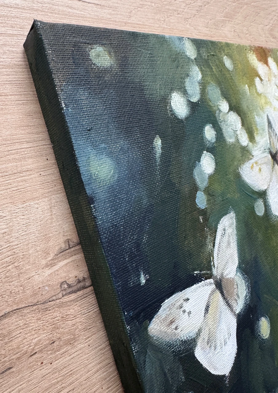 Работа без рамы, но торцы окрашены в цвет фона, чтобы можно было сразу повесить в интерьер.