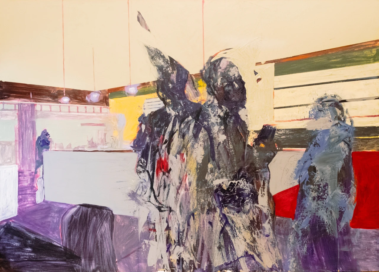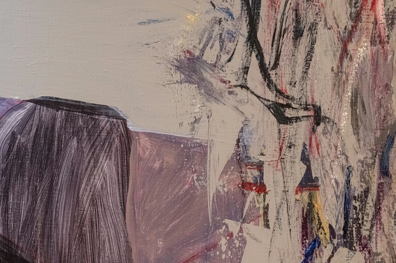Фигуры, растворённые в пространстве, существуют здесь как следы присутствия — не как персонажи, а как состояния. Живописная среда построена на напряжении между плотными тёмными силуэтами и светлыми архитектурными плоскостями, где цвет и жест формируют ощущение паузы, ожидания и внутреннего движения. Работа исследует границу между телом и средой, присутствием и исчезновением.