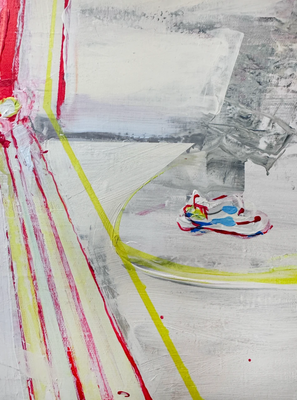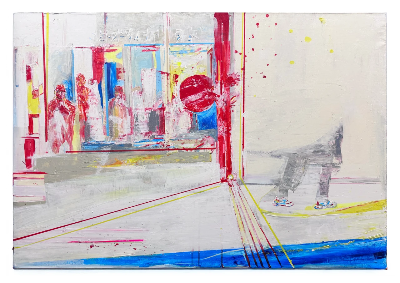 Японское кафе ночью — живописная сцена, в которой ночное пространство намеренно инвертировано: свет кажется дневным, а фигуры — призрачными и нестабильными. Через многослойные мазки, графические линии и фрагментированные силуэты работа исследует границу между реальностью и её кинематографической интерпретацией, создавая ощущение искусственного, сконструированного ночного мира.