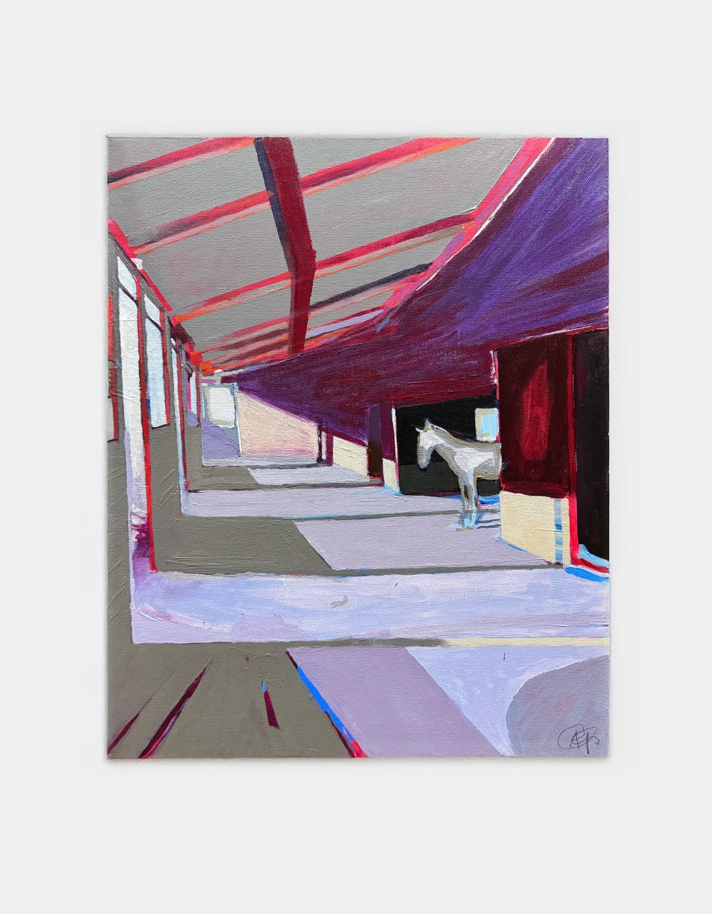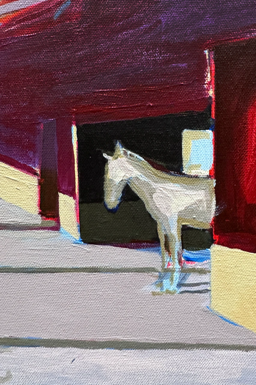 Красный цвет здесь работает иначе — не замыкает, а направляет, усиливая глубину и задавая вектор взгляда. Фигура лошади появляется как пауза в этом ритме — тихая, но фиксирующая момент присутствия внутри структуры. Работа исследует, как повтор и направление могут формировать ощущение пространства сильнее, чем его физические границы.