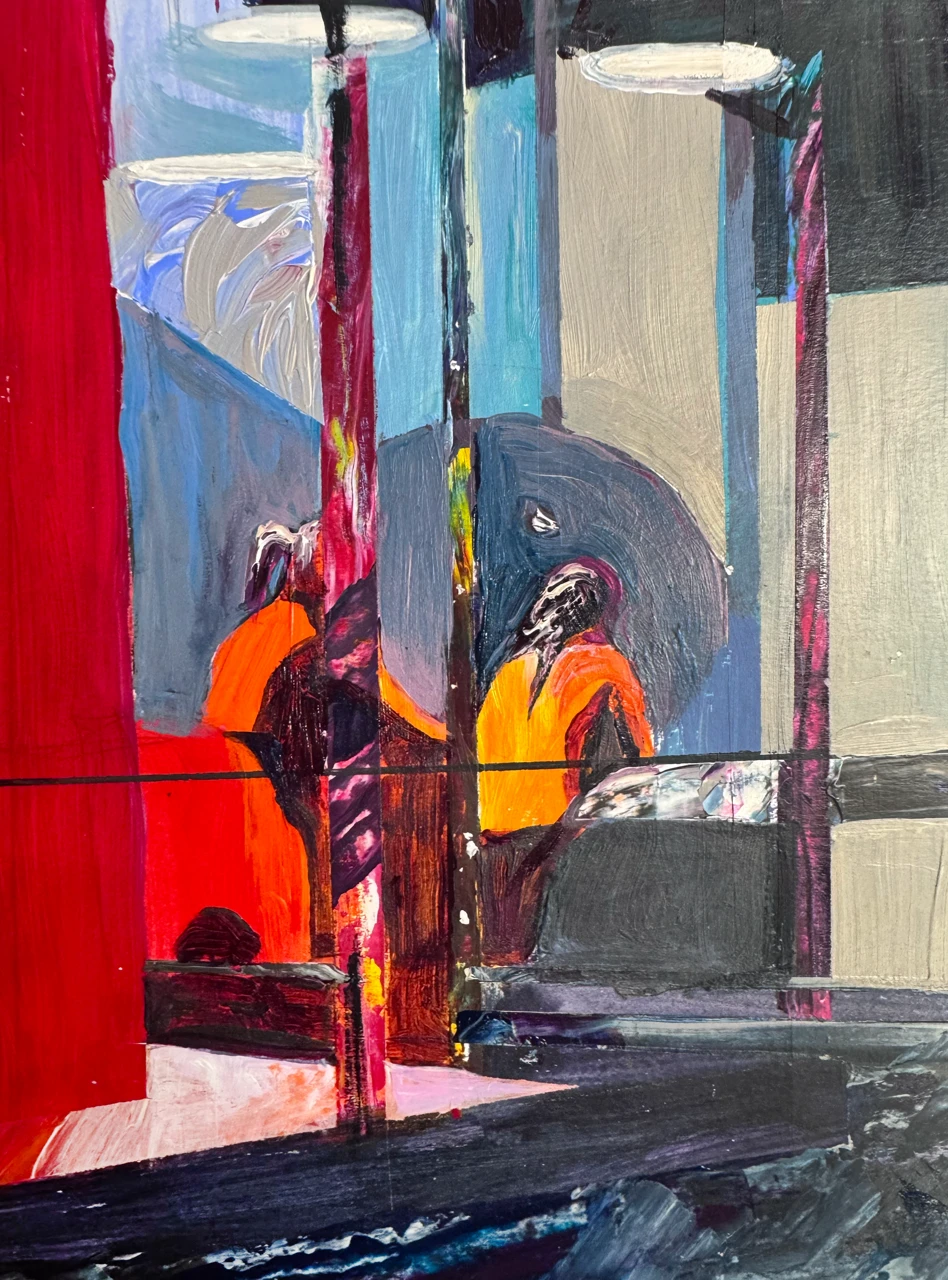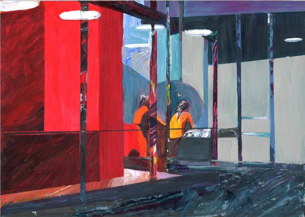 Эта одна из работ-рефлексий на тему общественных пространств и одиночества в них. Здесь — два человека находятся в иллюзорном уединении — в большом красном кафе-аквариуме.