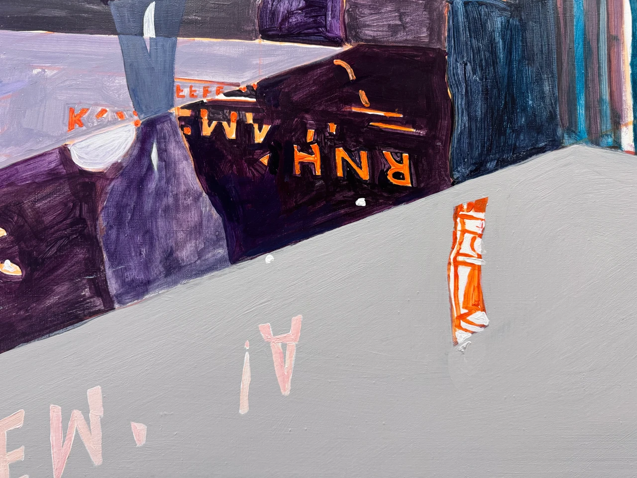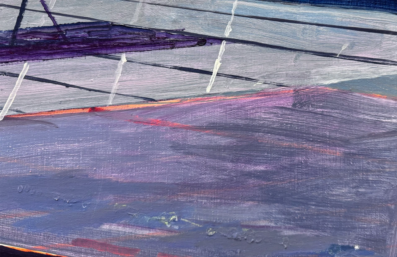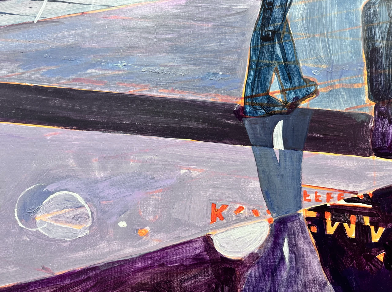 Живописное размышление о пространстве транзита и состоянии между «здесь» и «там». В композиции соединяются фрагменты архитектуры аэропорта, отражения и разорванные текстовые элементы, создавая ощущение смещённой перспективы и внутреннего движения. Холодная палитра и ритм плоскостей усиливают чувство ожидания, временной паузы и психологической нестабильности путешествия.