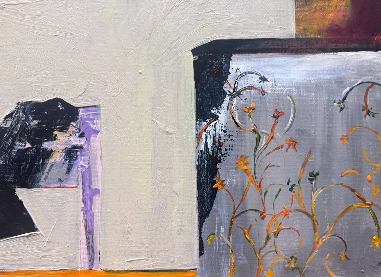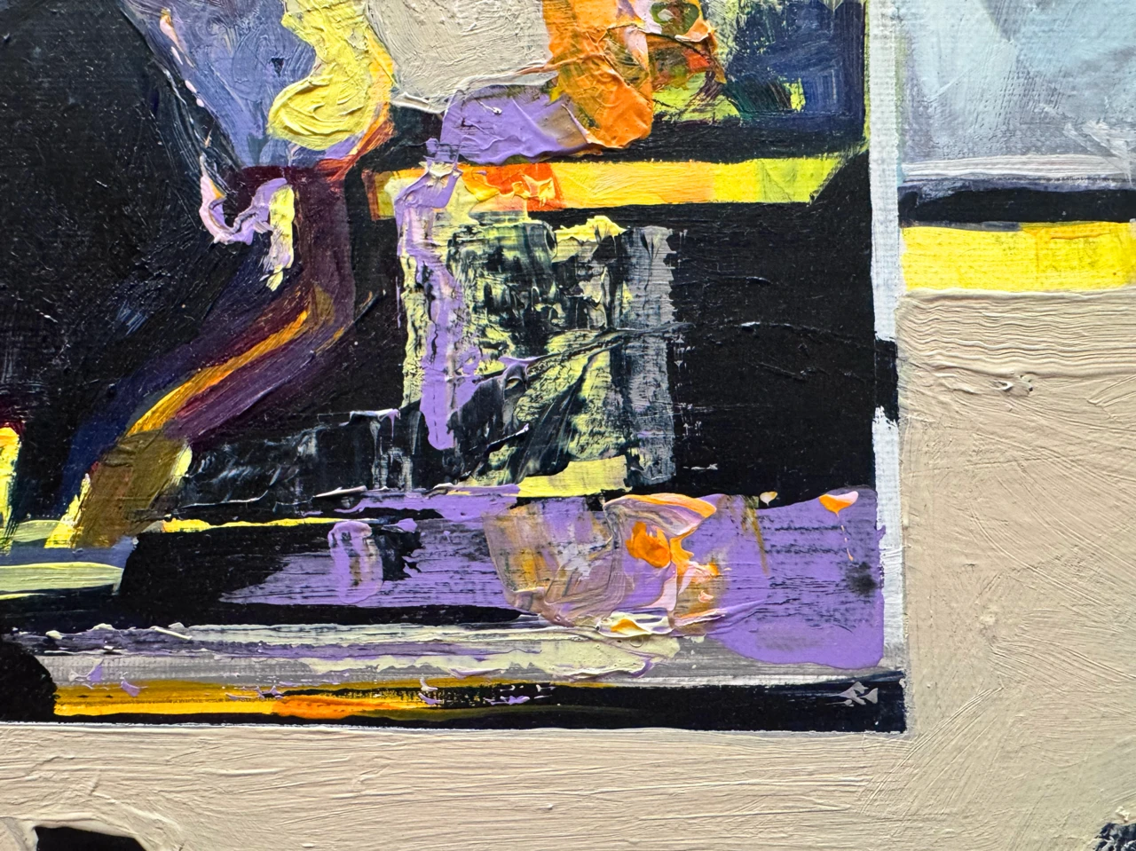 Эта живописная работа о внутреннем пространстве дома как месте памяти и уязвимости. Фрагментированная композиция и тёплые жёлто-лиловые акценты создают ощущение сцены, увиденной сквозь время — между реальностью и воспоминанием. Работа балансирует между интерьером, фигурой и абстракцией, оставляя зрителю пространство для личных интерпретаций.