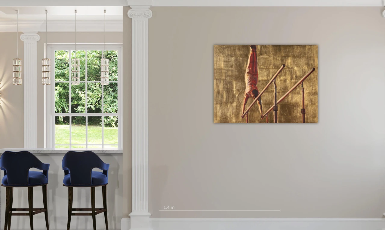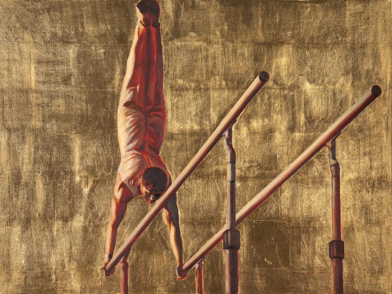Атлеты лишены индивидуальности и функционируют как знаки — универсальные образы, транслирующие идею дисциплины, контроля и стремления к недостижимому идеалу. Золотой фон не только возвышает фигуру, но и фиксирует её в состоянии вне времени, превращая в объект созерцания и «поклонения».