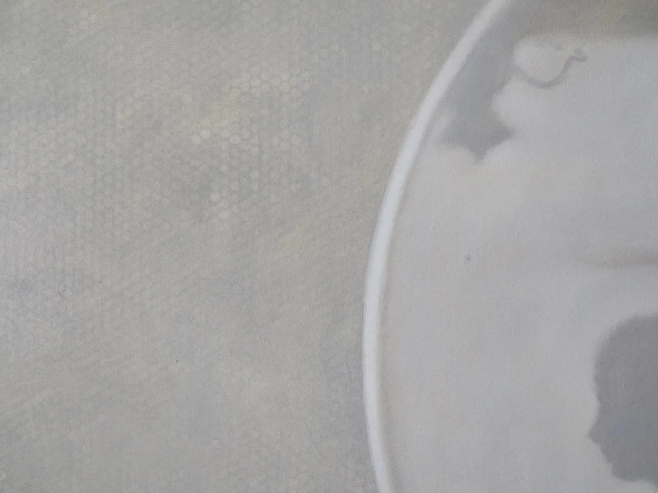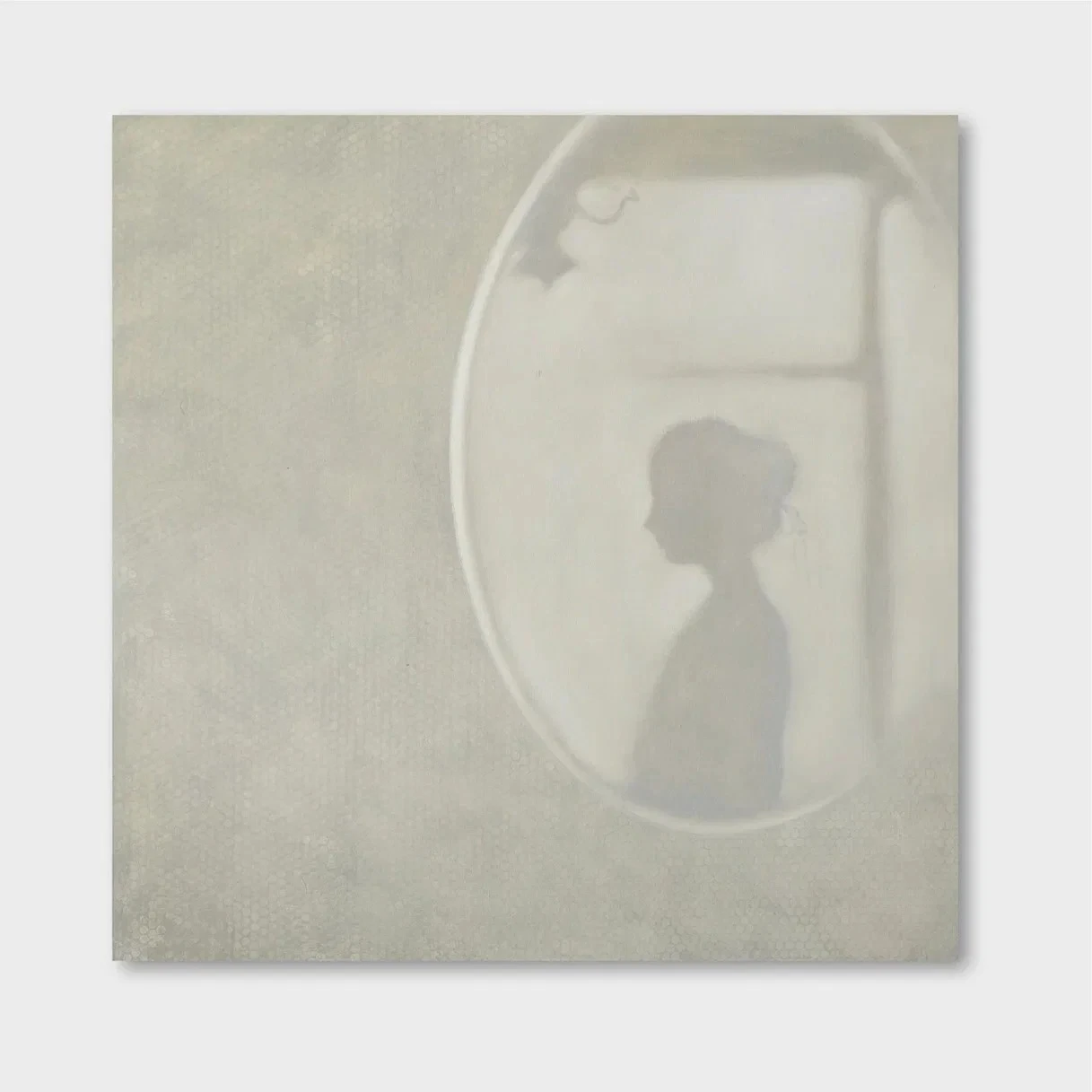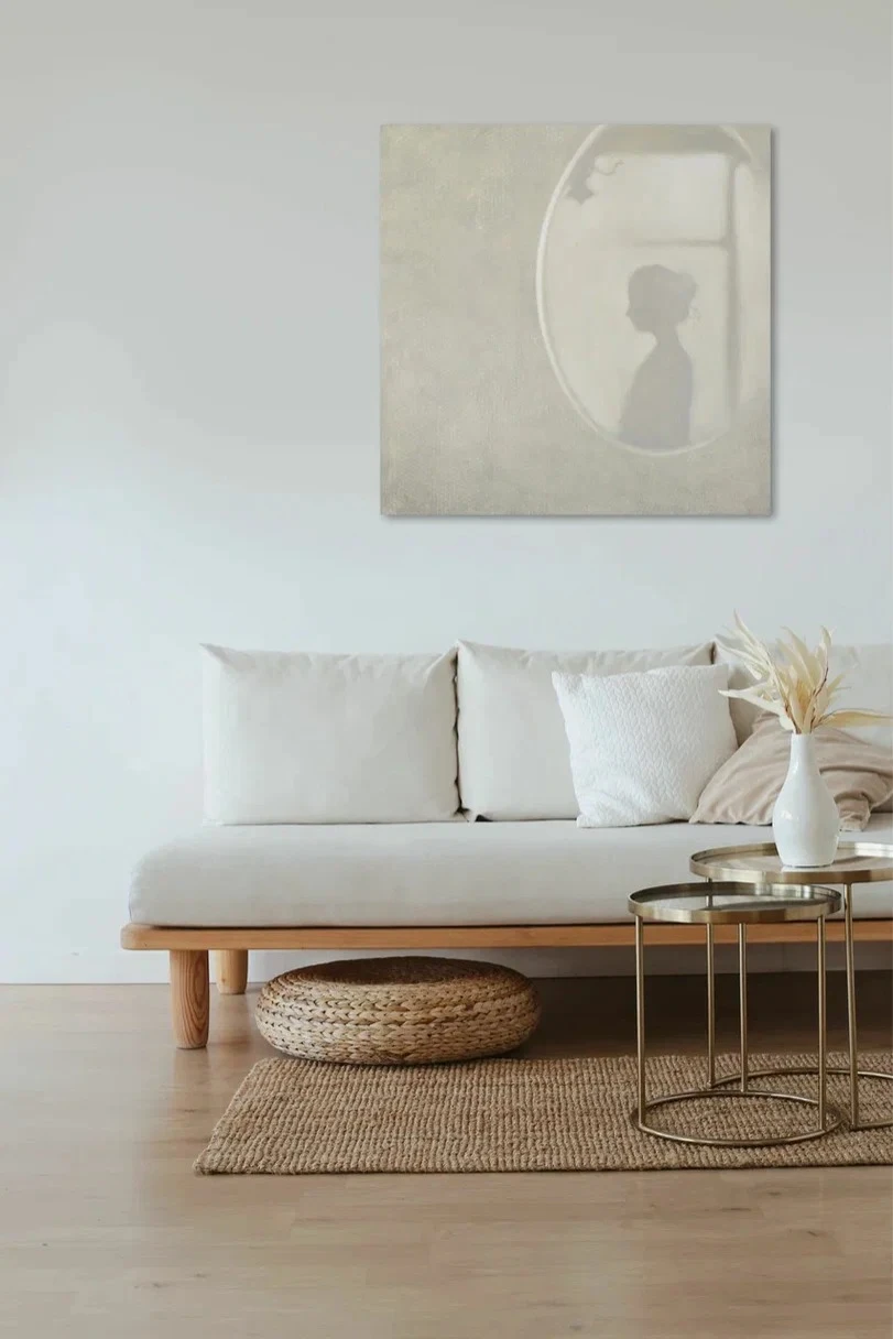 Написанная в сдержанной цветовой гамме, работа обладает необычной текстурой, а также игрой света и тени в выражении изящного силуэта девушки и вторящего ей силуэта предметов интерьера.