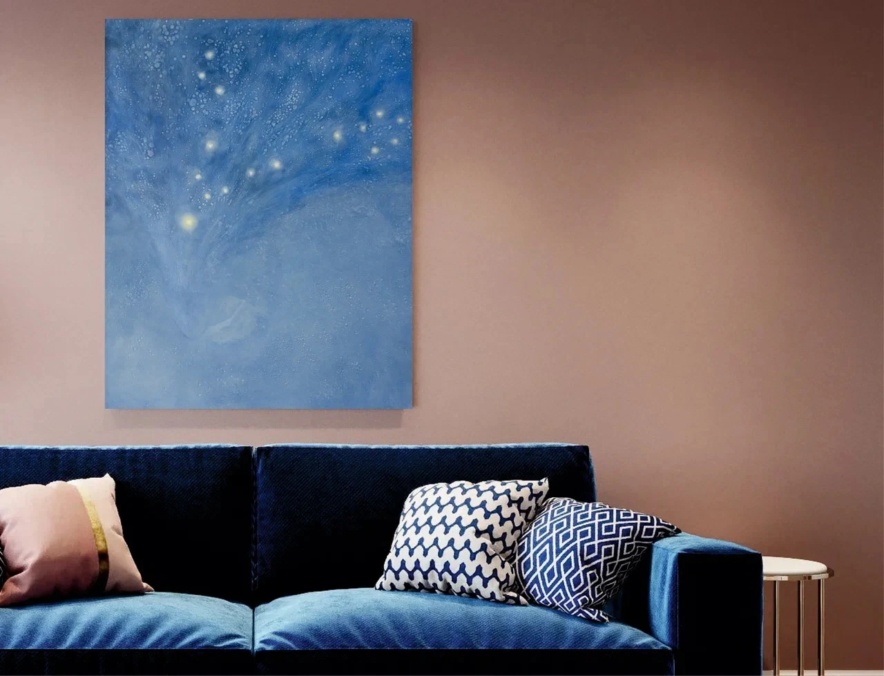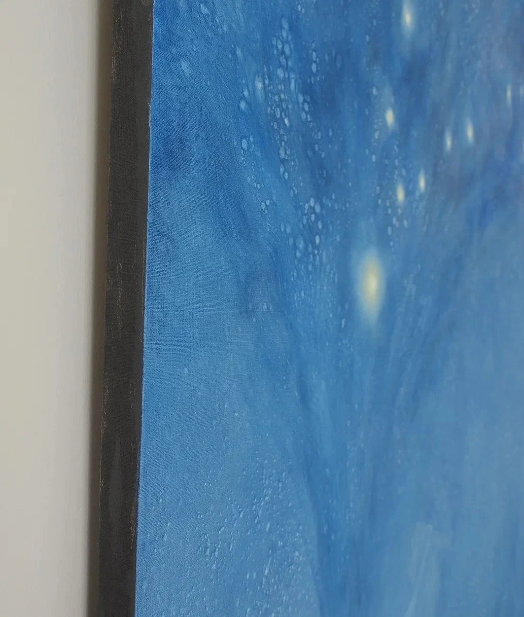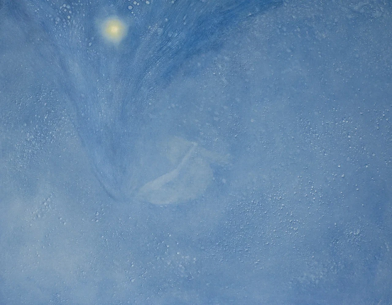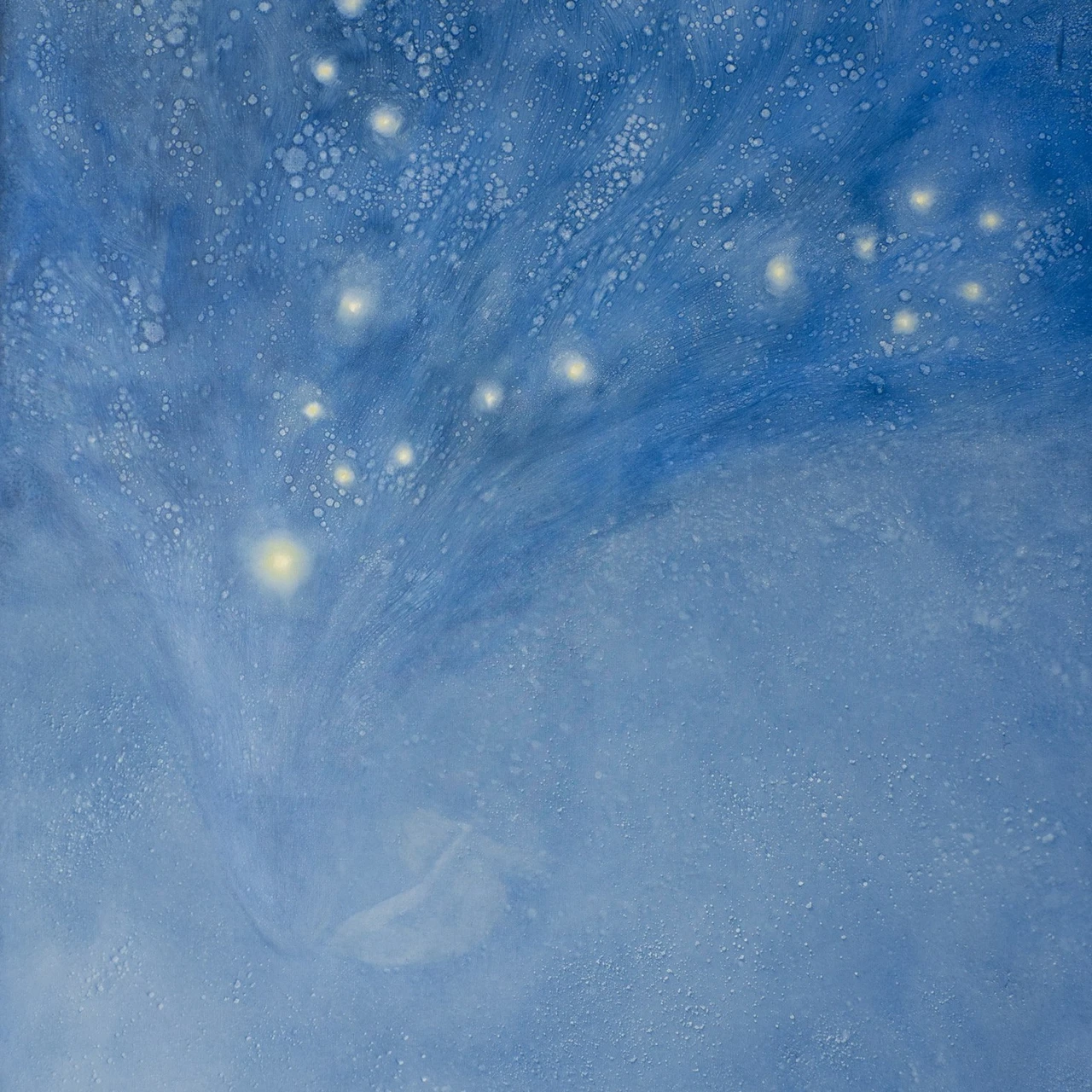 Главная героиня картины, и мы вместе с нею, погружается в морскую глубину, окутанная своим чувством — всеобъемлющим, светлым и тёплым. Вокруг сияющие искорки, мелькающие и сияющие, кажущиеся близкими. И след, оставленный в медленном погружении, насыщенный голубой поток, в котором зажигаются звезды, целое созвездие.