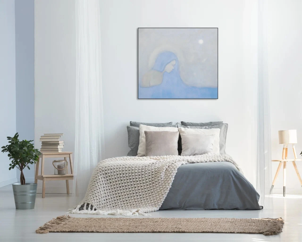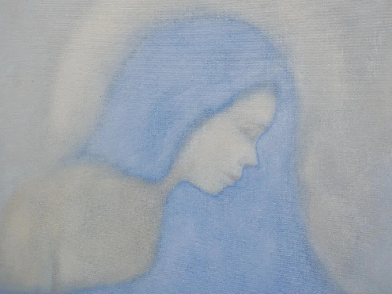 Картина, созданная в тишине и умиротворении. Грусть здесь — не тяжелая ноша, а лёгкая дымка, окутывающая душу. Фигура девушки — хрупкая и тихая, укрытая голубой вуалью собственной печали.