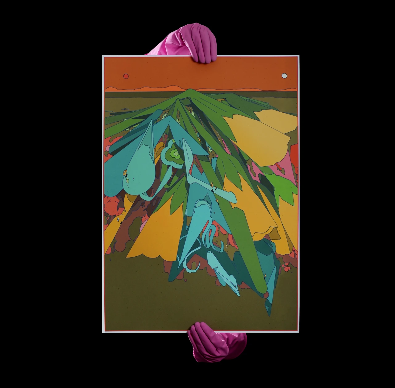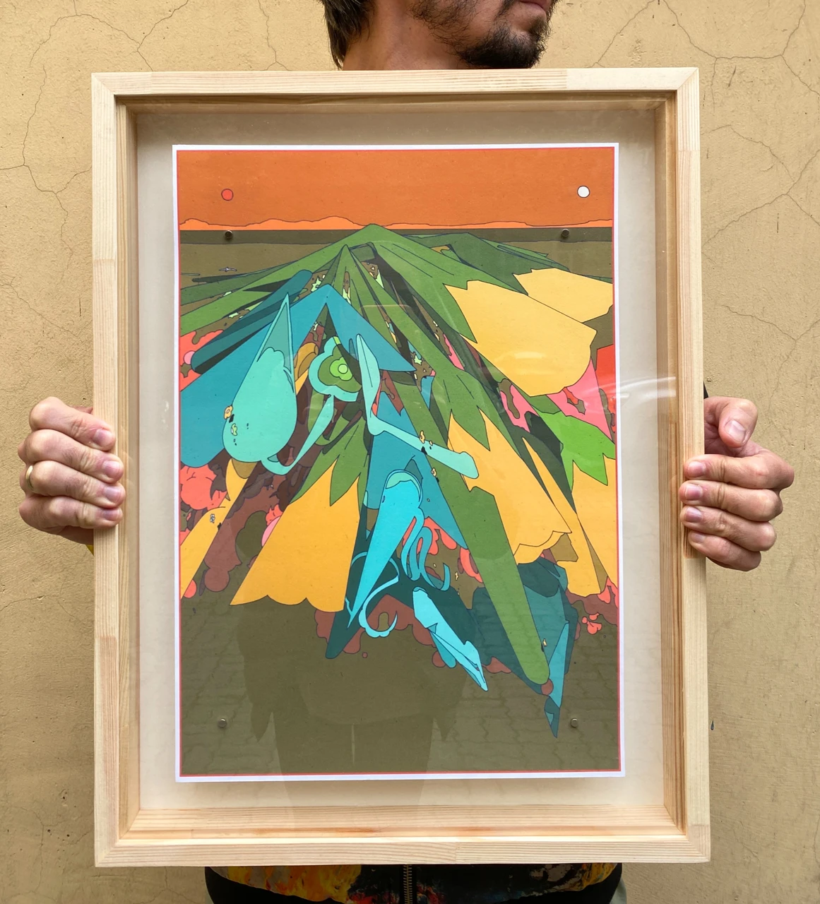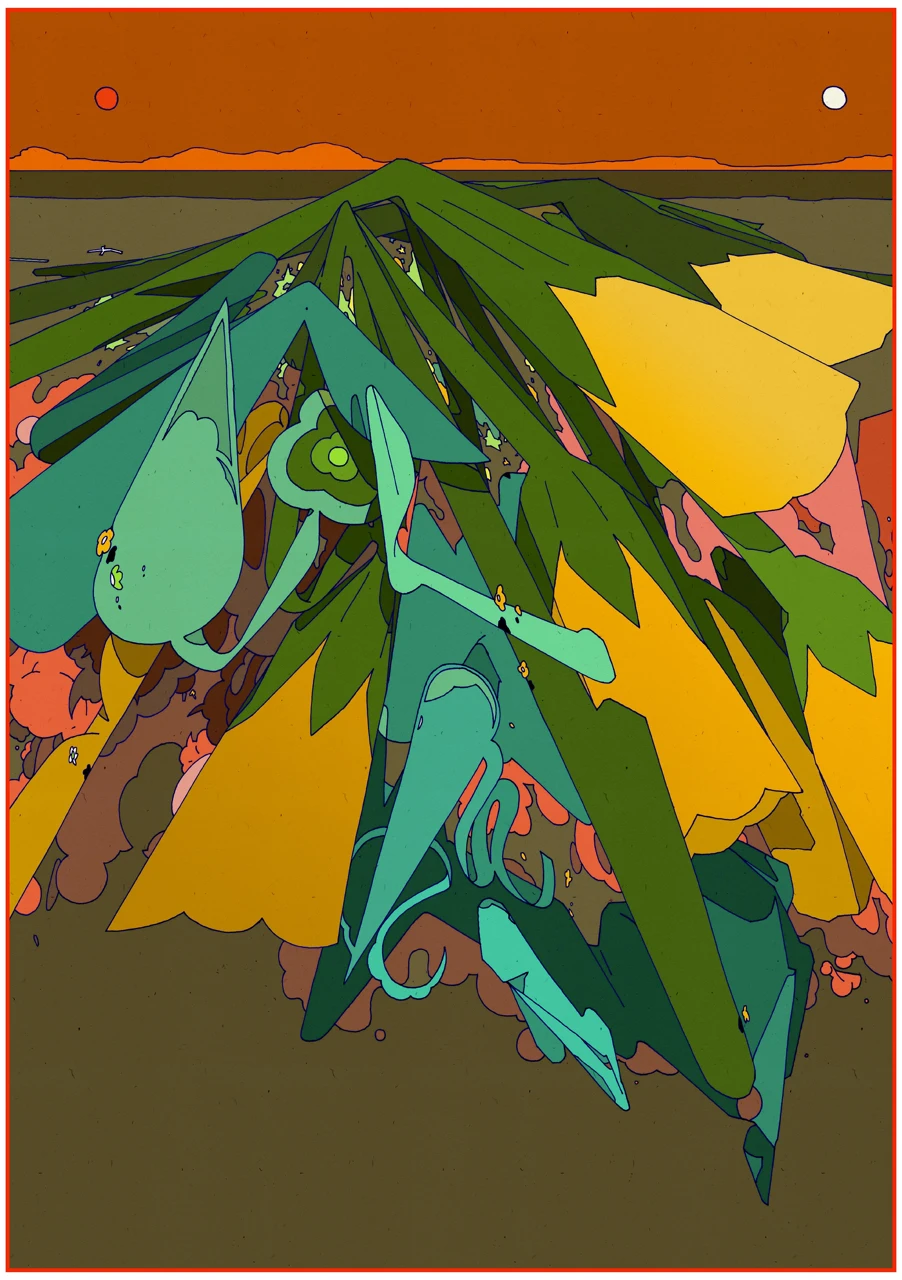 Работа создана на основе рисунка без эскиза в городе Уфа в 2024 году. Взяв за основу часть композиции, я продолжил ее уже на бумаге и затем сделал 2 версии работы в формате тиражной графики.