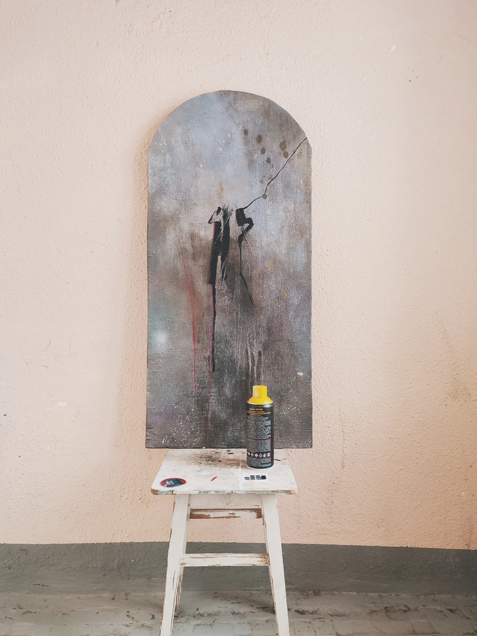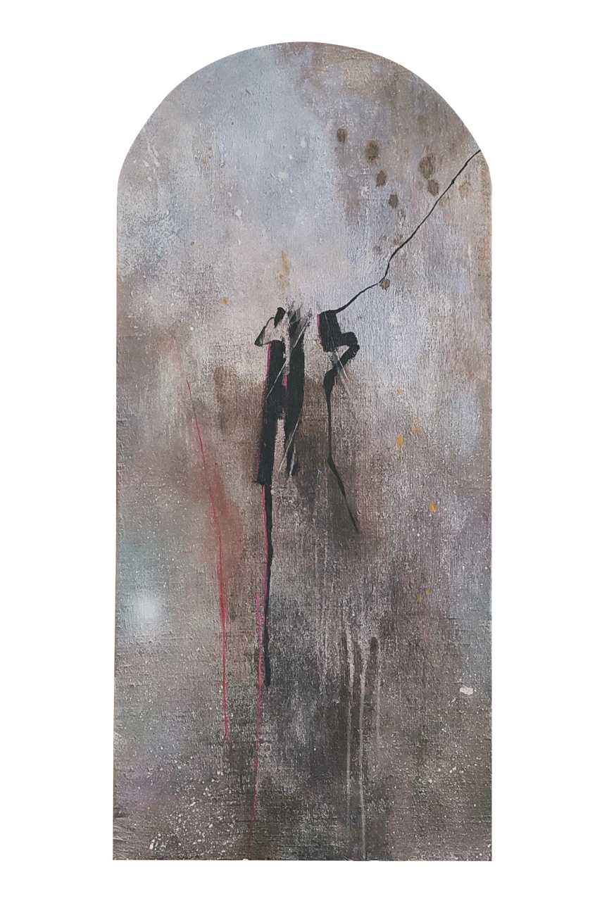 Арочная форма полотна придаёт работе архитектурную выразительность и фокусирует внимание на центральной части. Текстурный, грубый фон усиливает ощущение экспрессивности и эмоциональной напряжённости. Размытые переходы от светло-серого к тёмно-коричневому, имитирует состаренную поверхность, напоминает стену или камень.
