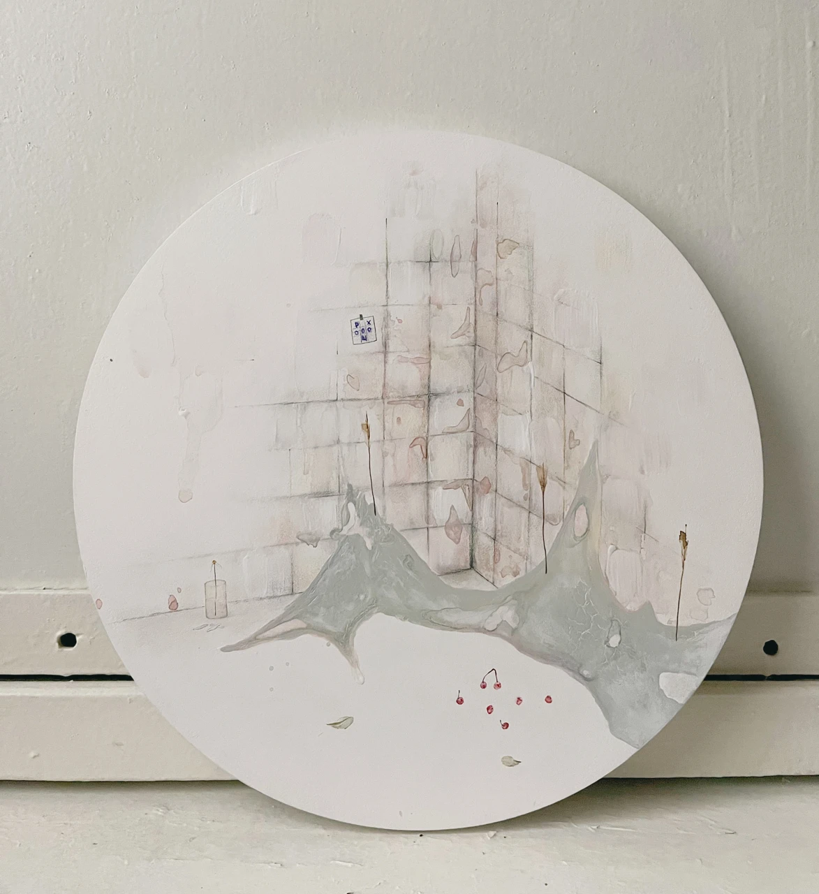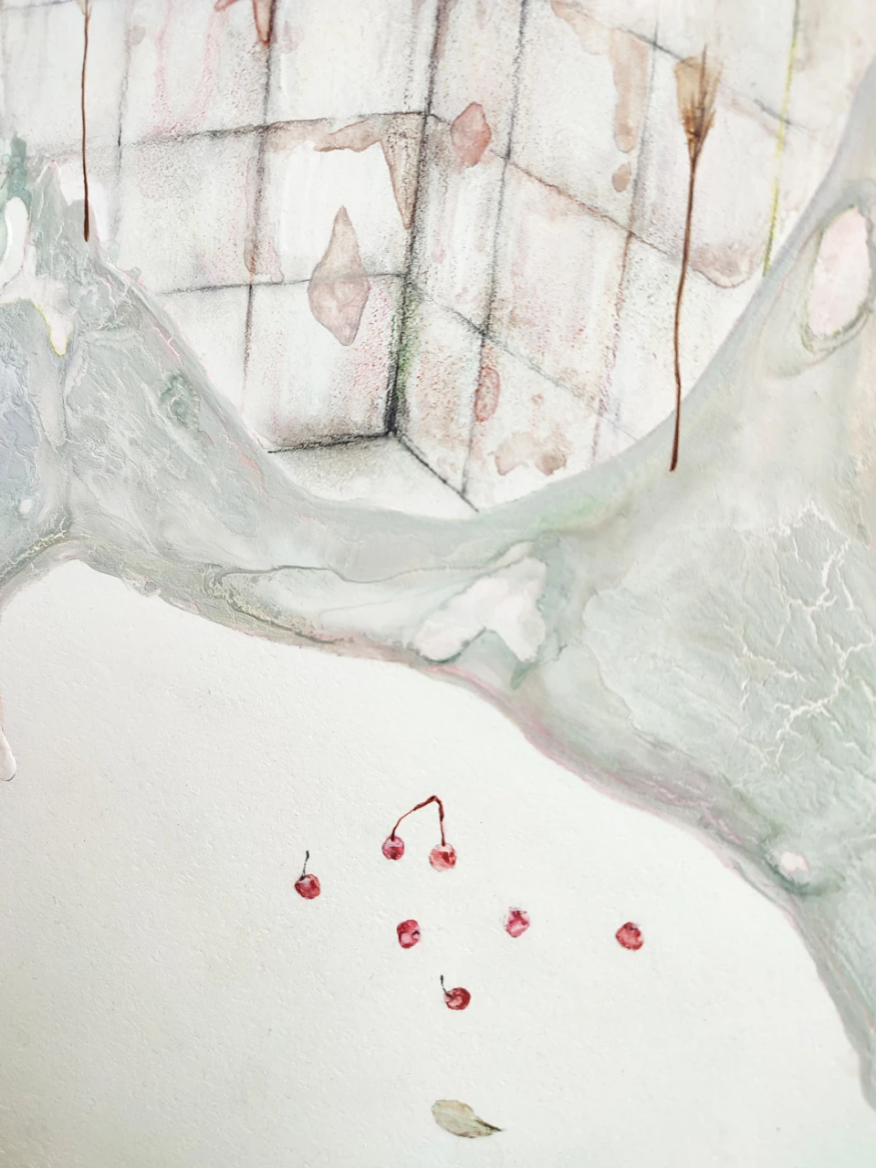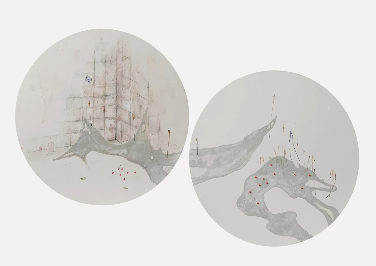 Диптих. Здесь изображены абстрактные композиции, выполненные в приглушённых, пастельных тонах. Работа может восприниматься как вместе, так и по раздельности.
