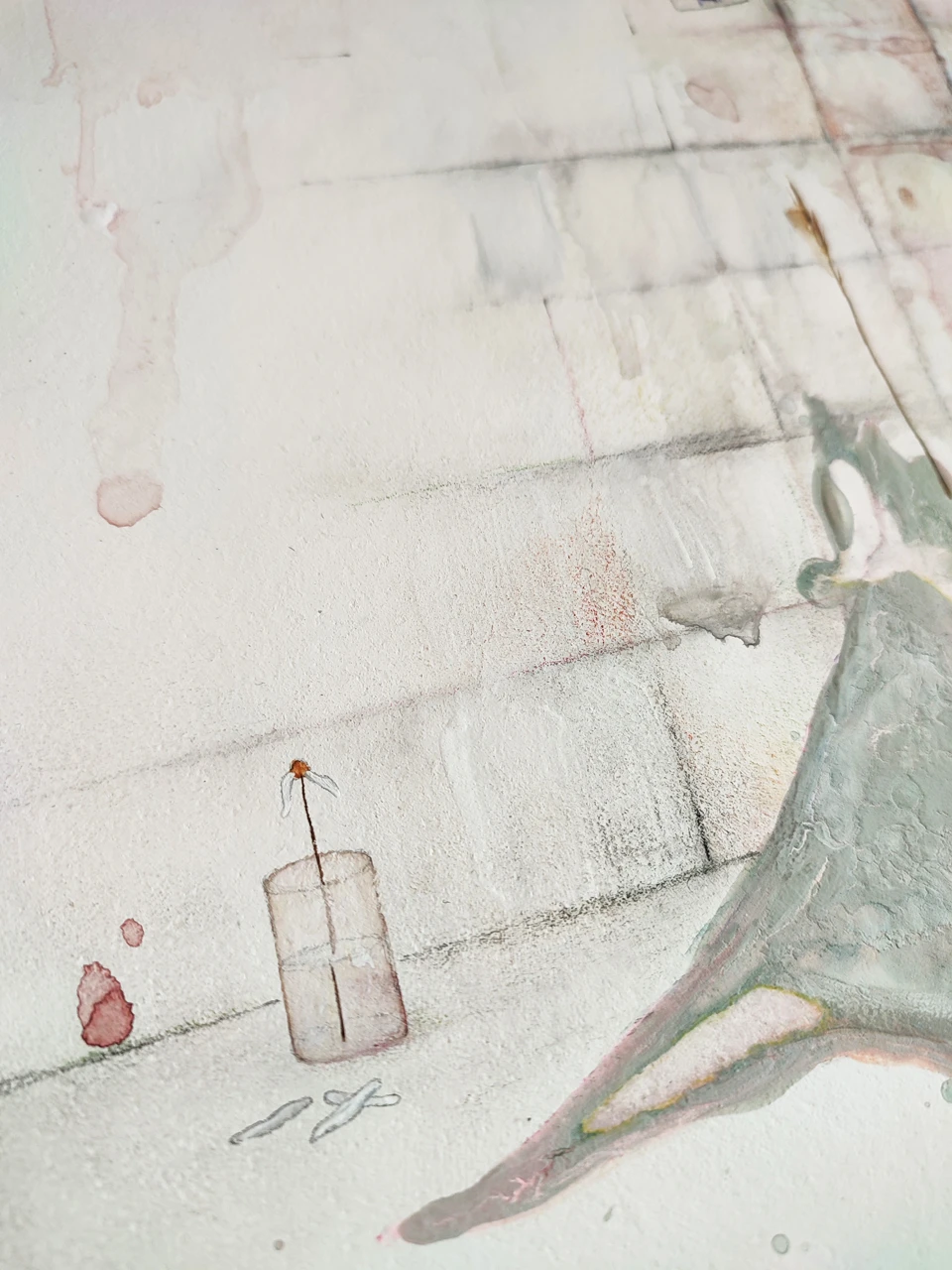 Я использует сдержанную цветовую гамму и тонкие детали, чтобы погрузить зрителя в созерцательное настроение. Композиции оставляют простор для интерпретации — каждый может увидеть в них что-то своё: от руин забытого мира до абстрактных природных структур или просто плитку в ванной.