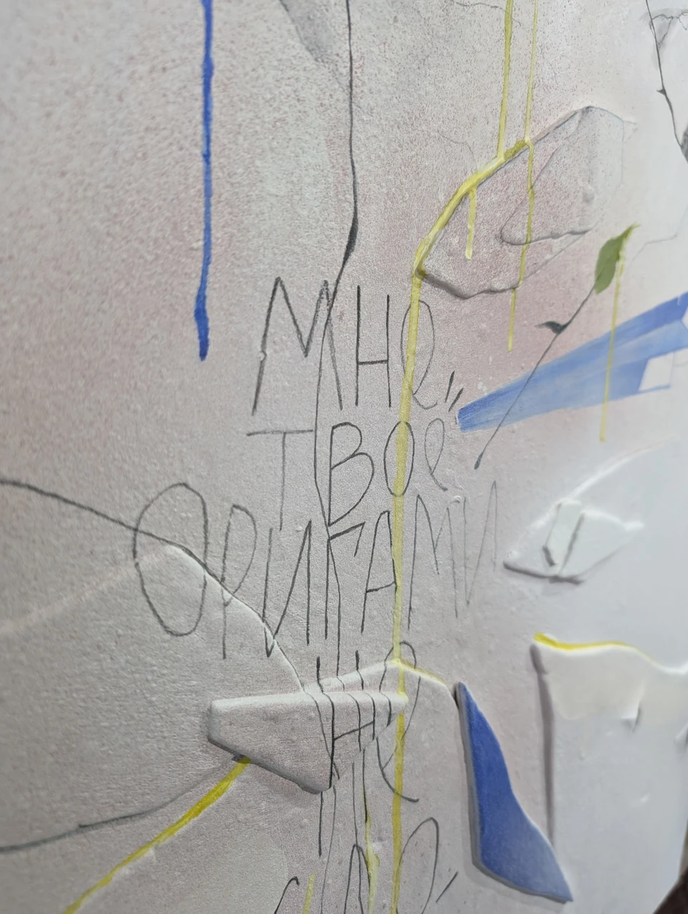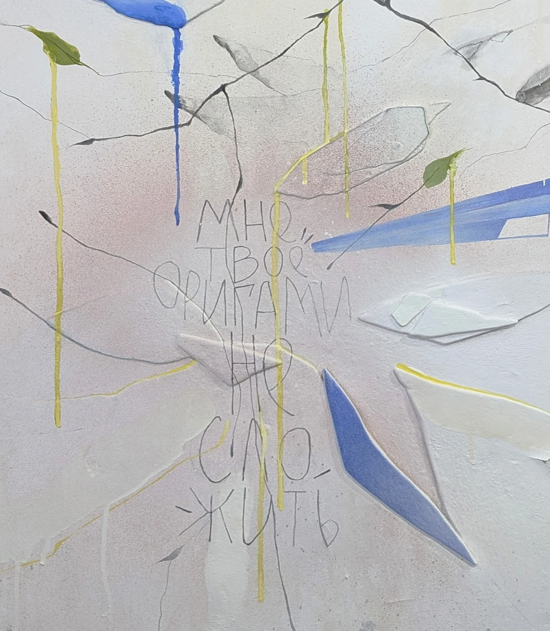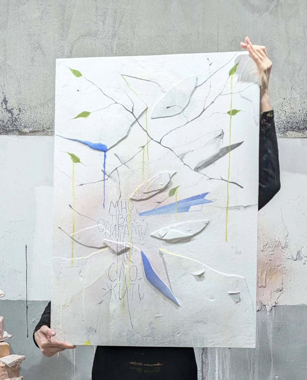 Я делала этот холст из кусочков штукатурки, которые откололись с другой работы- обрабатывала и клеила в изящную композицию. Здесь много фактур и слоев, что придаёт работе тайну.