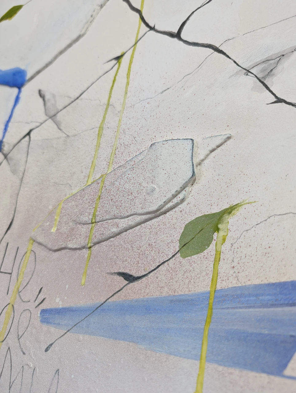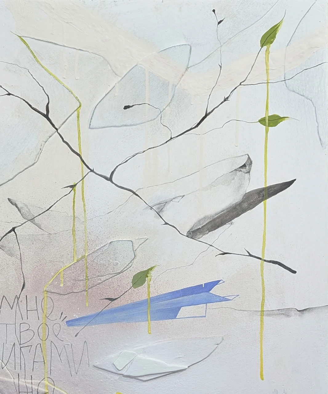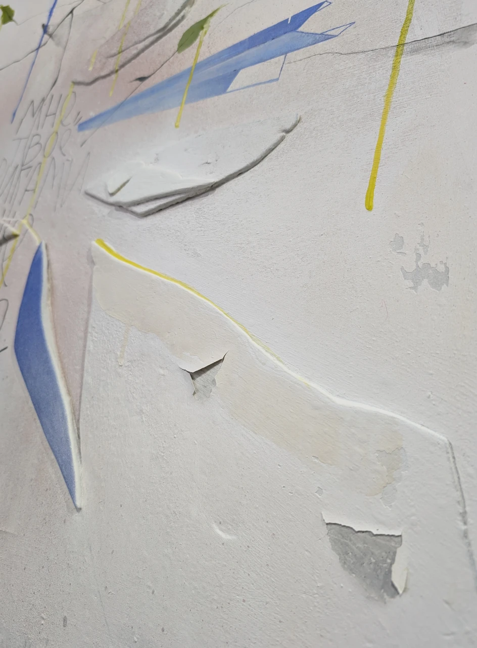 Я делала этот холст из кусочков штукатурки, которые откололись с другой работы- обрабатывала и клеила в изящную композицию. Здесь много фактур и слоев, что придаёт работе тайну.