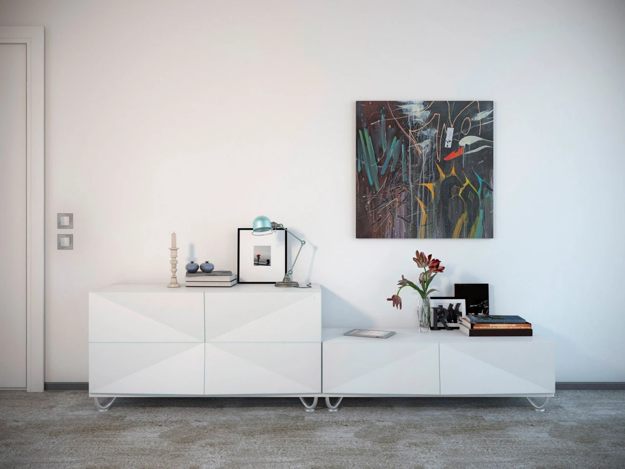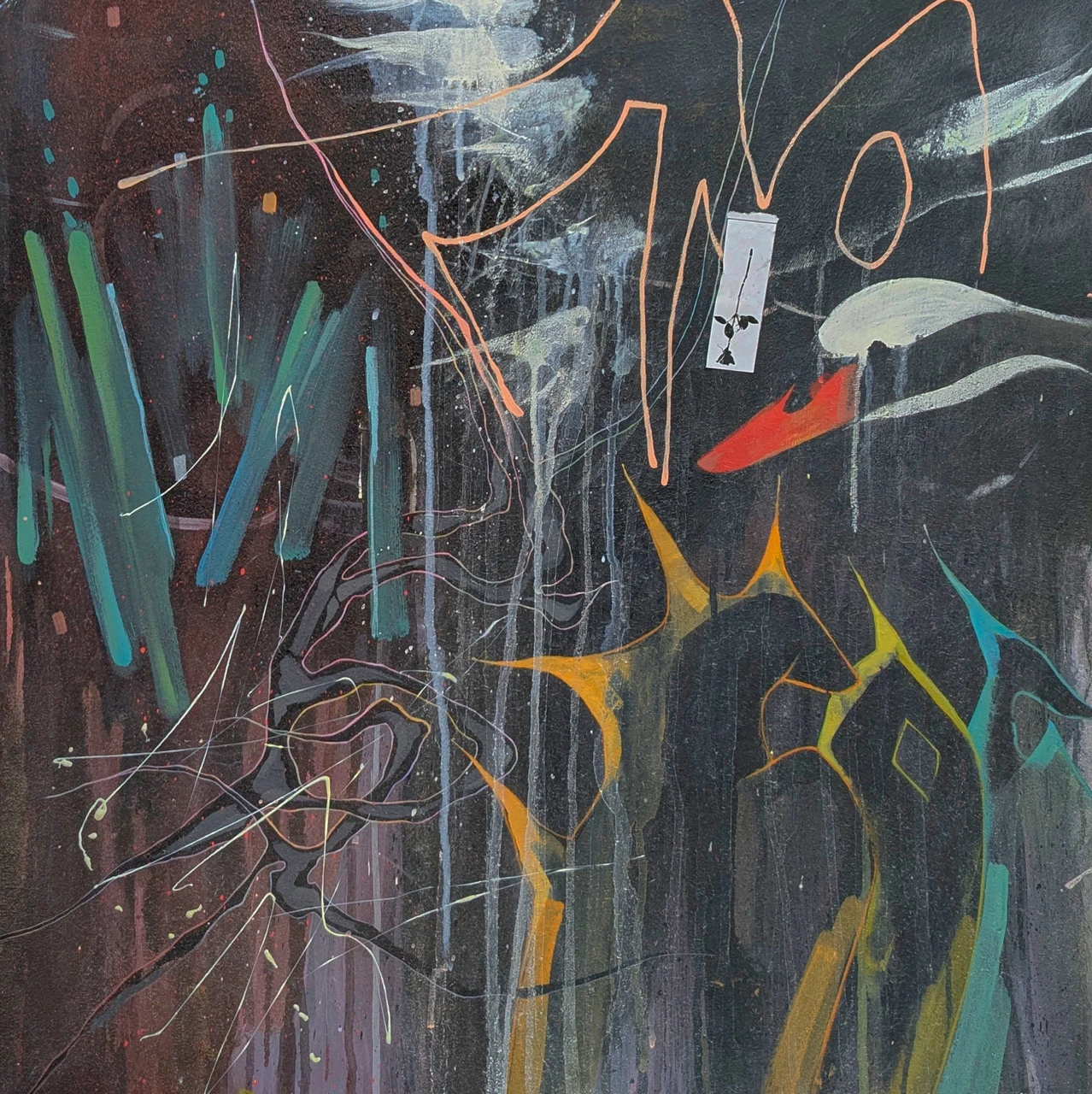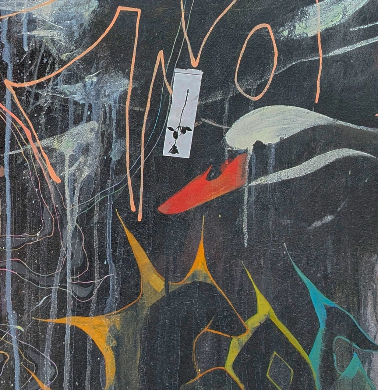 На этой картине изображён абстрактный сюжет, в котором преобладают тёмные, насыщенные оттенки и яркие пятна. Композиция выглядит хаотичной, но сбалансированной: сочетание острых углов, плавных линий и цветовых акцентов создаёт динамику и напряжение, добавляют драматизма. А белый лебедь и роза отсылают нас к поиску смыслов-любви, прощении, красоте