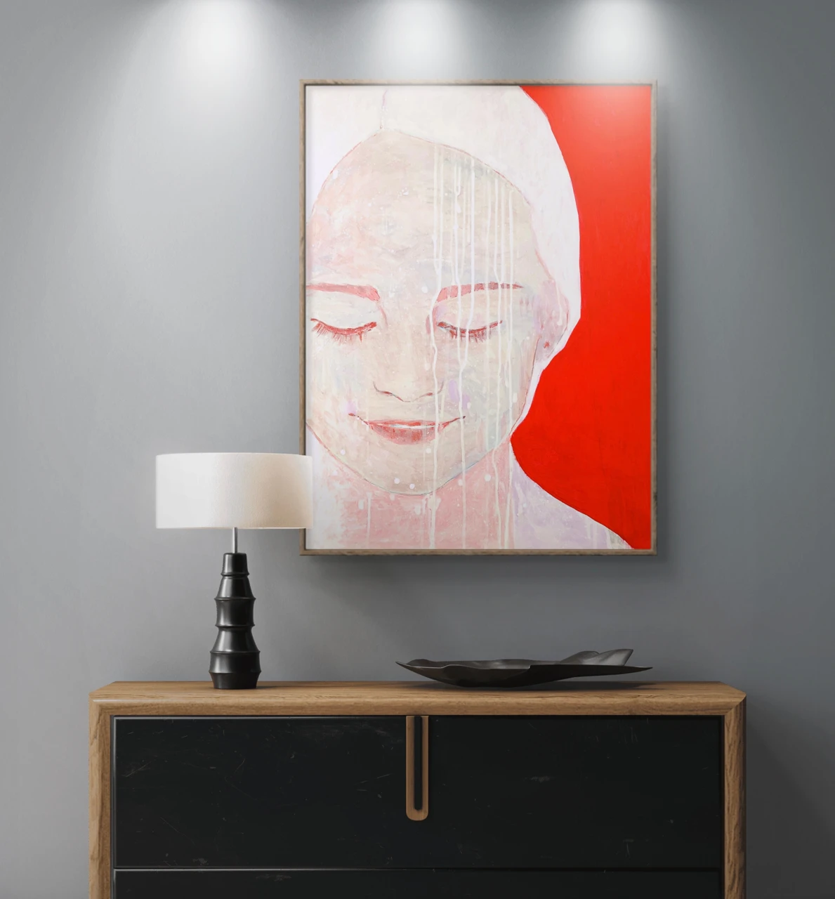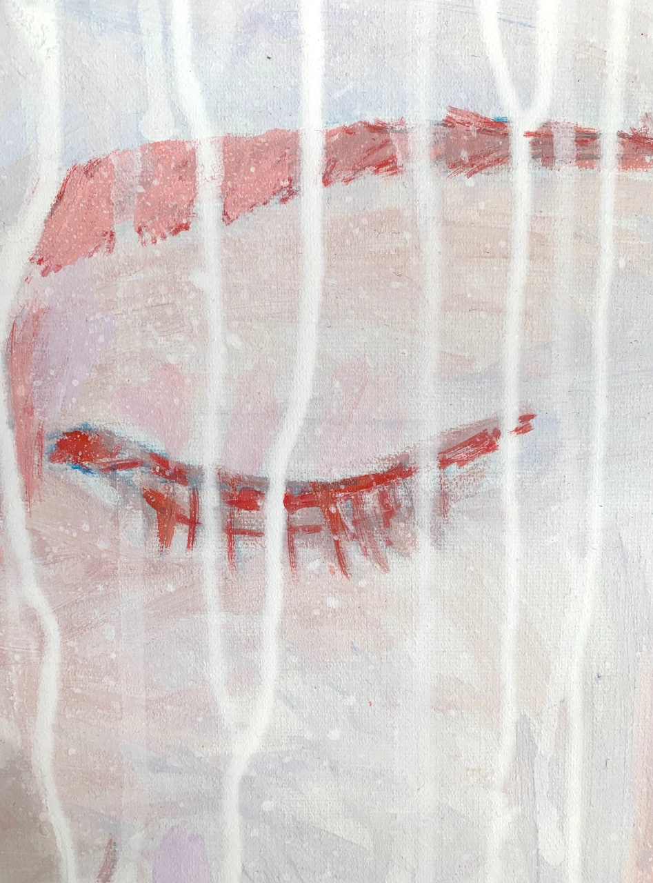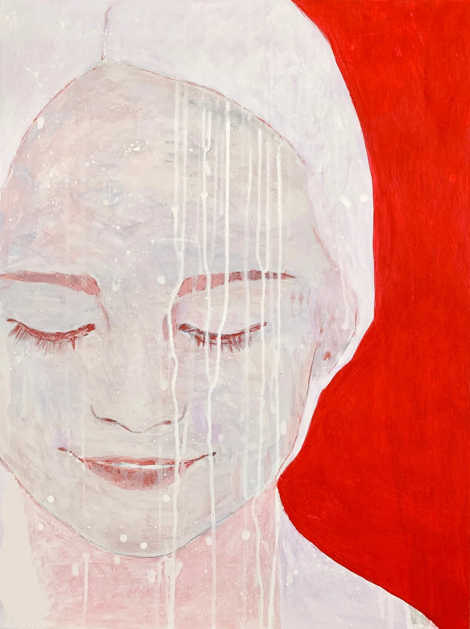 Первая картина триптиха из серии «13», которую я посвятила исследованию переходного возраста. Состояние покоя перед изменениями. Глаза закрыты от сосредоточенности и предвкушении на внутреннем состоянии перед началом процесса взросления. Красный - энергия гормонального всплеска, пульс. Белый/светлый - чистота, начало.