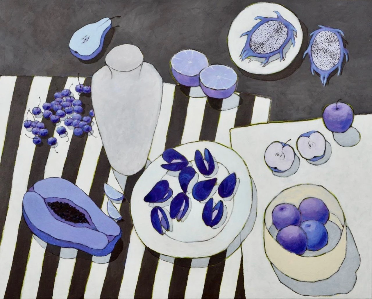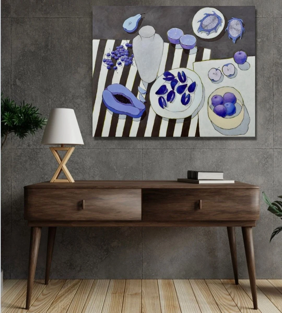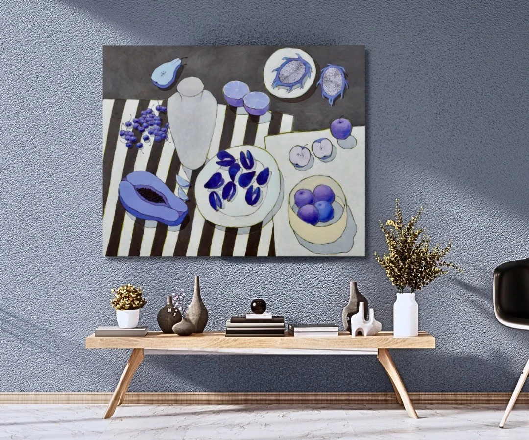 Медитативный натюрморт, построенный на тонкой игре ритмов и контрастов. Ограниченная цветовая палитра: фрукты — в насыщенных холодных оттенках ультрамаринового и фиолетового, фон — черно-белый. Всё это придаёт «сцене» театральную выразительность. Чёткие чередования полос становятся визуальной метафорой повторяющегося времени. На этом фоне предметы будто замирают, приобретая характер знаков: плоды не просто элементы композиции, они словно символы чувственного опыта, вкуса жизни.