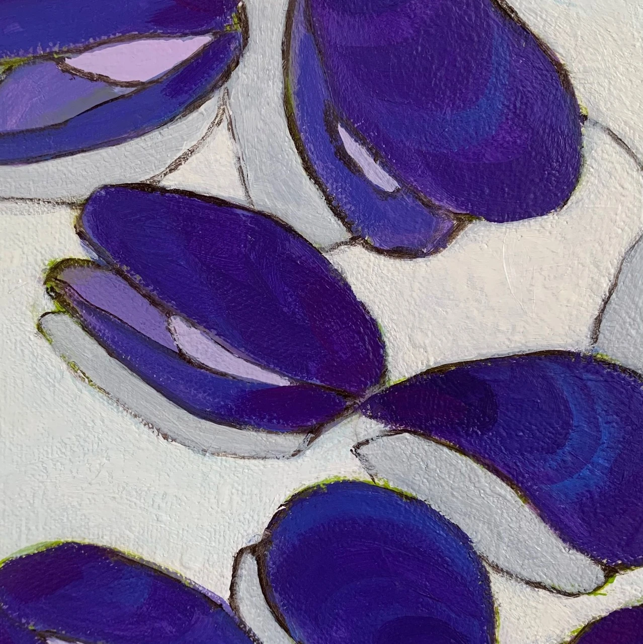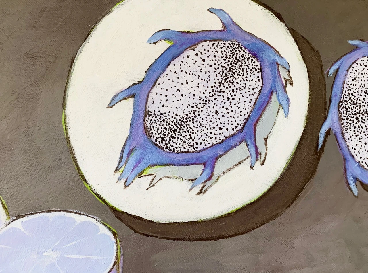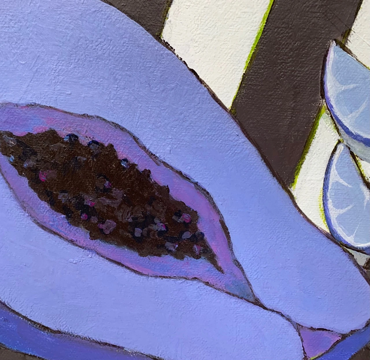 Медитативный натюрморт, построенный на тонкой игре ритмов и контрастов. Ограниченная цветовая палитра: фрукты — в насыщенных холодных оттенках ультрамаринового и фиолетового, фон — черно-белый. Всё это придаёт «сцене» театральную выразительность. Чёткие чередования полос становятся визуальной метафорой повторяющегося времени. На этом фоне предметы будто замирают, приобретая характер знаков: плоды не просто элементы композиции, они словно символы чувственного опыта, вкуса жизни.