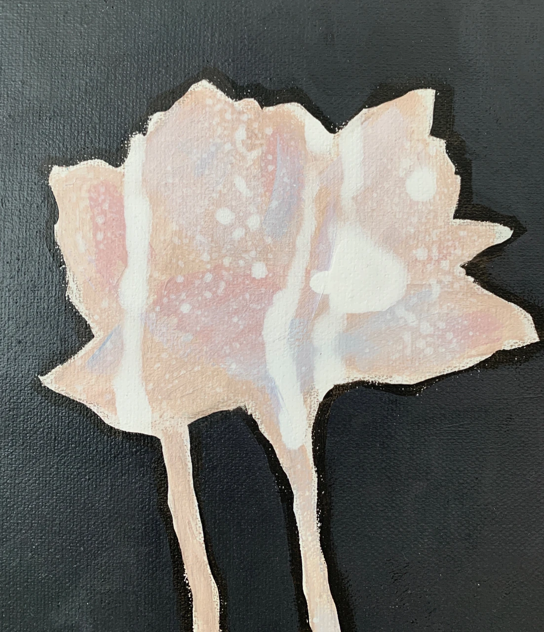 Если в предыдущих работах красный фон работает как импульс, гормональные и телесные перемены, то в этой работе темный (почти черный) фон работает как глубина и бездонность и неизведанное внутреннее пространство.