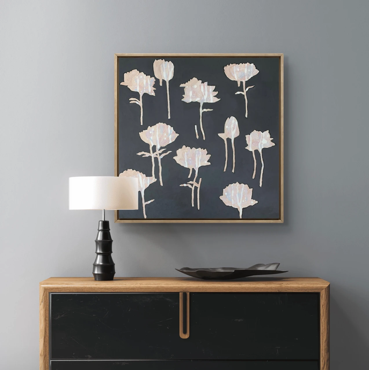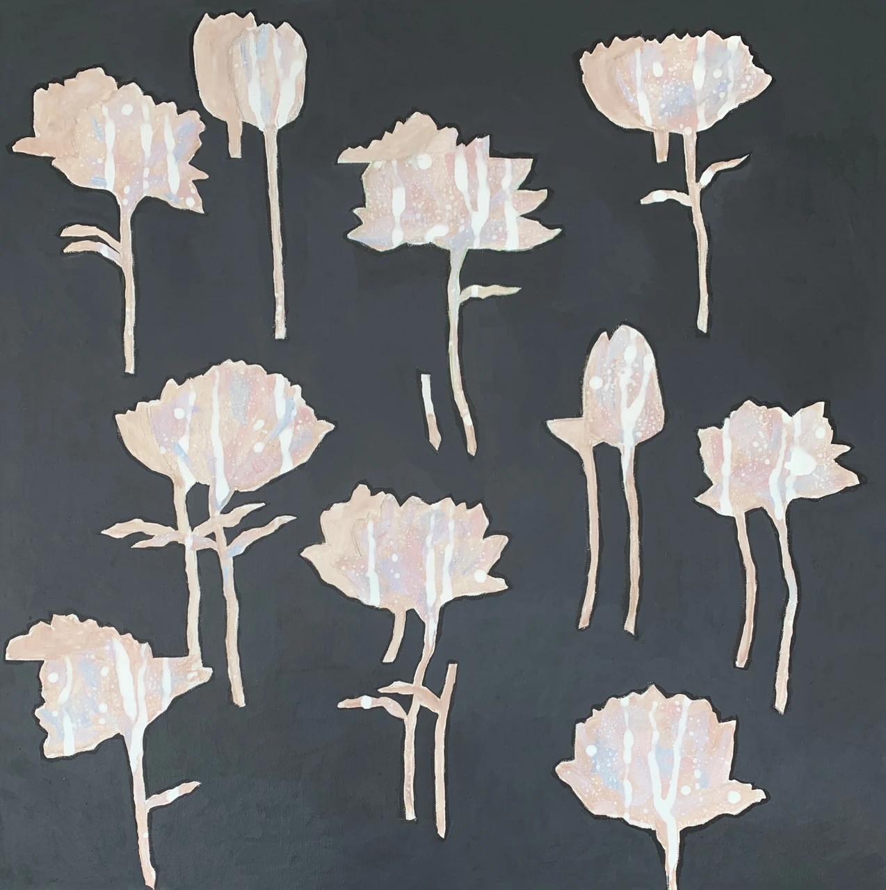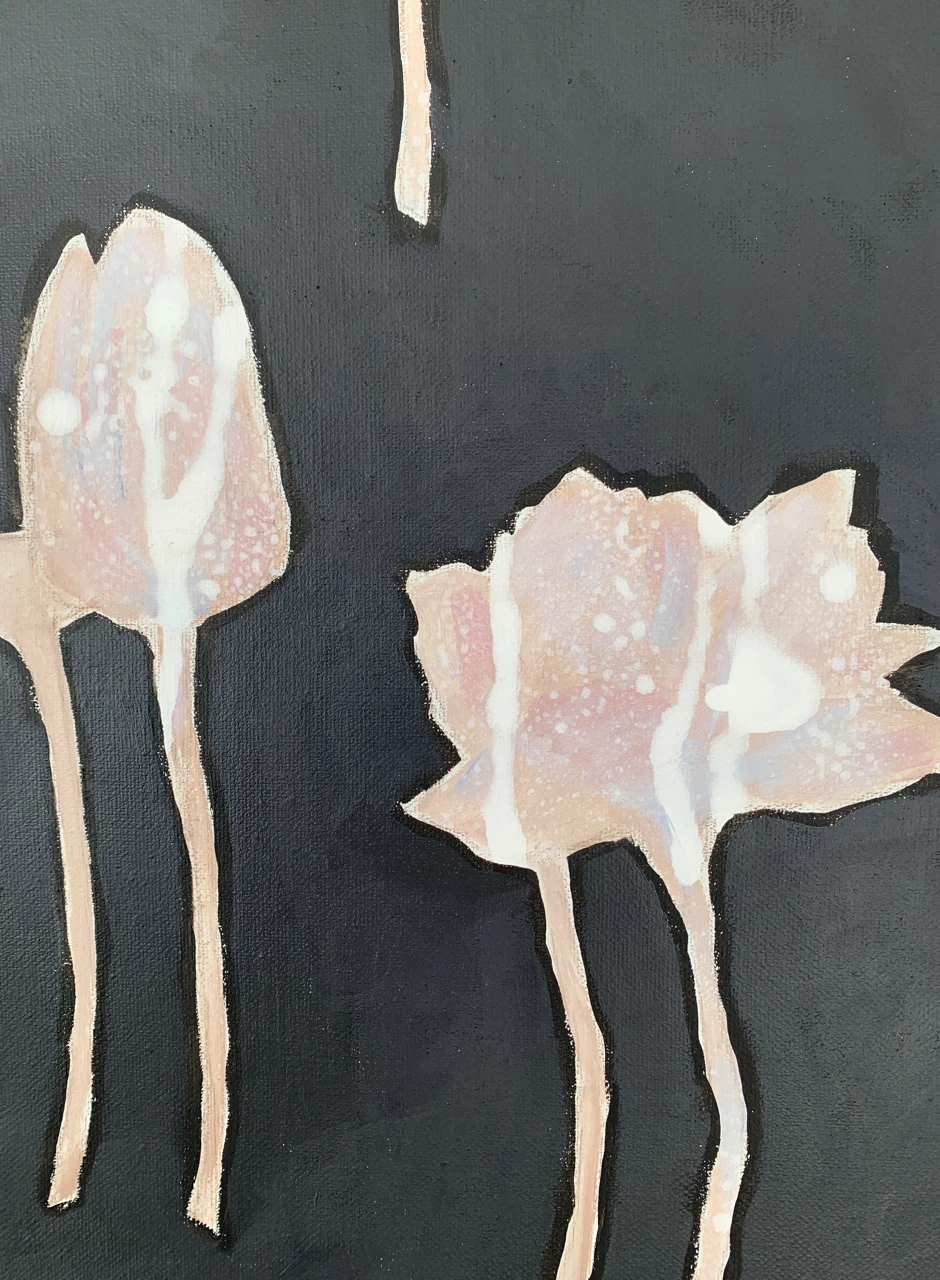 Работа продолжает серию «13». Фигура девочки здесь полностью исчезает и цветы на темном фоне становятся метафорой новых мыслей, чувств и ощущений.