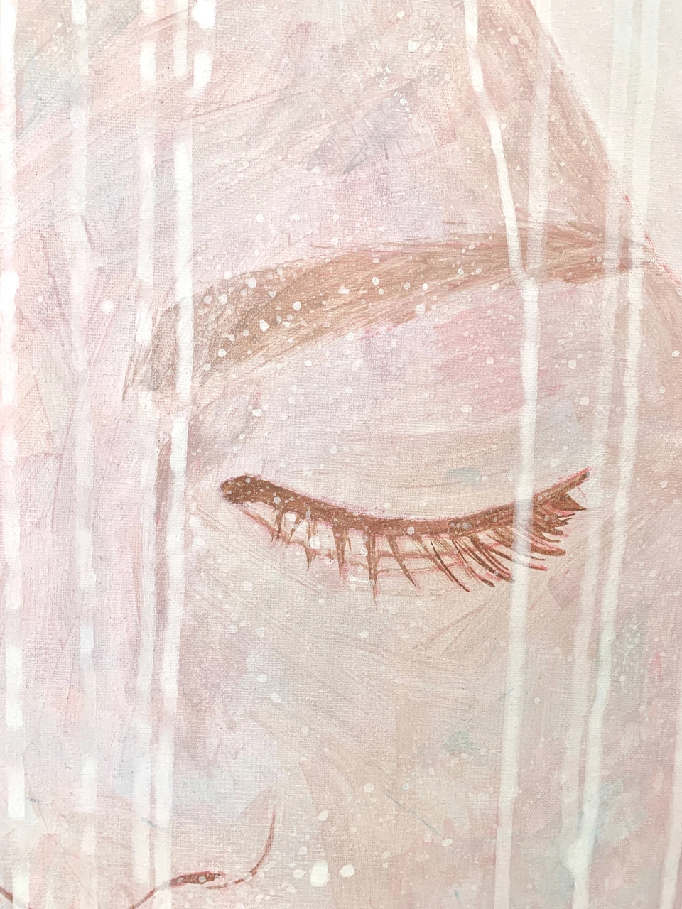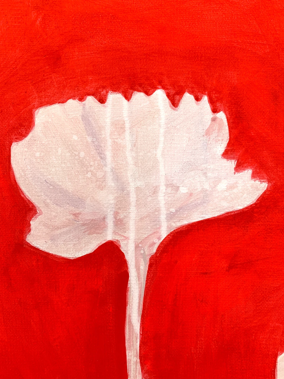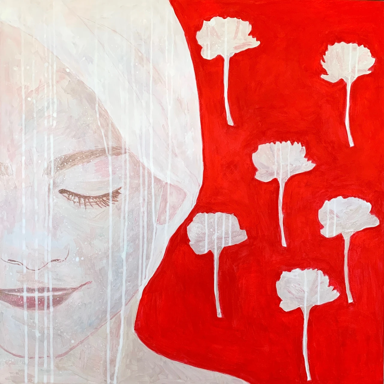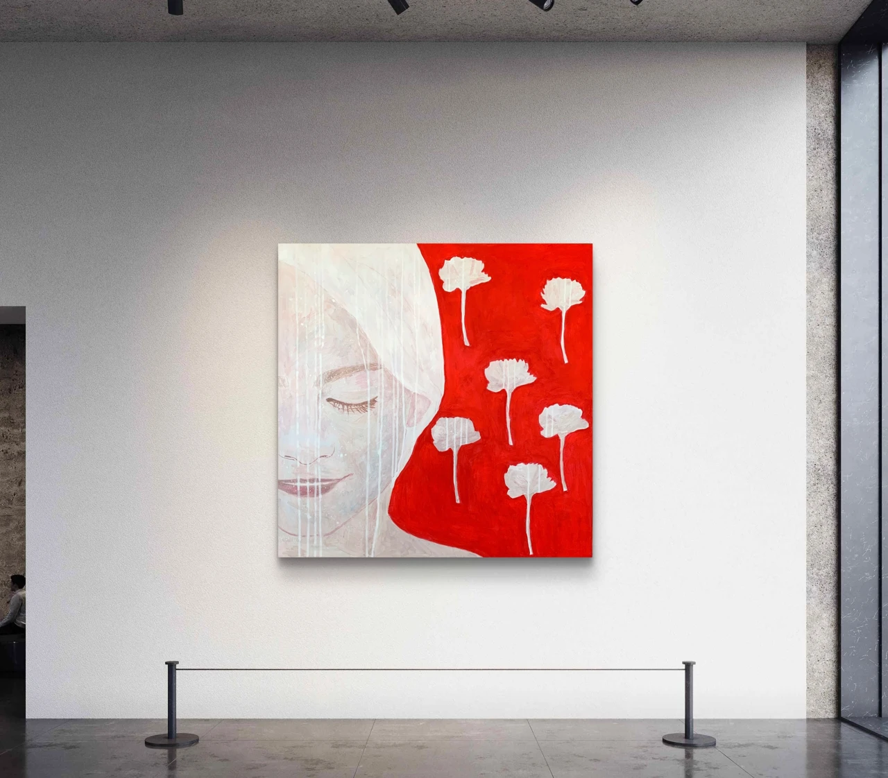 Вторая картина из триптиха, который входит в серию «13», посвященной исследованию переходного возраста. Вторая часть - момент разделения между «я была» и «я становлюсь»; между телом и голосом. Красный здесь также символизирует гормональные перемены, первую внутреннюю силу организма. Картина фиксирует тонкий рубеж - ту паузу, когда девочка еще ребенок, но уже стоит на пороге самостоятельности.