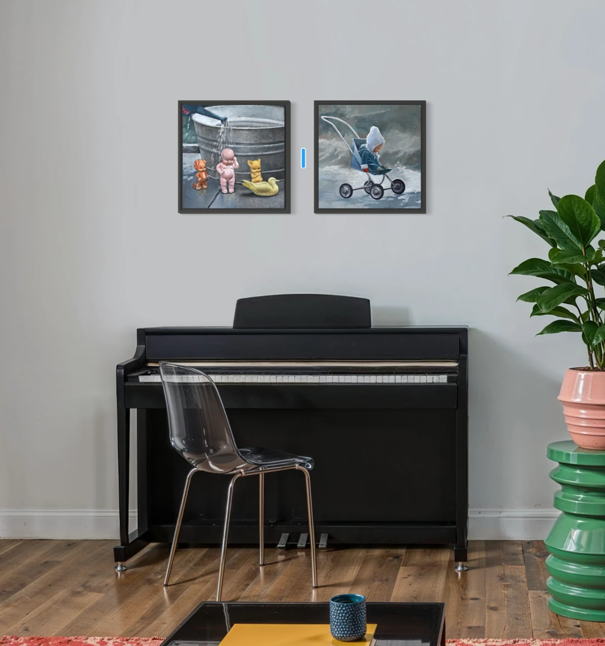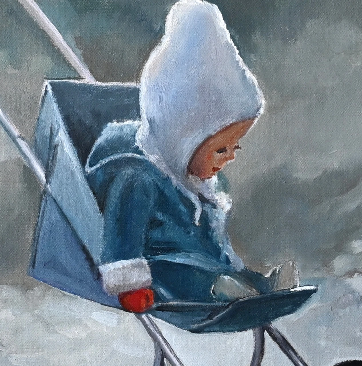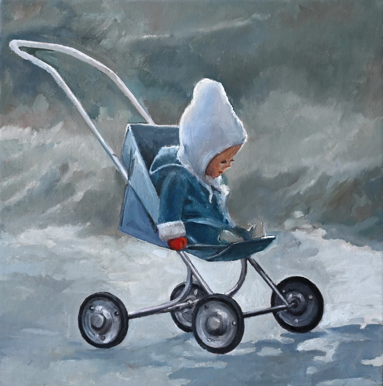 В работе «Кукла» изображена детская прогулочная коляска с сидящей в ней куклой, облаченной в зимнюю одежду. Художник передает меланхоличное настроение через сдержанную, холодную палитру, где доминируют оттенки серого, приглушенного синего и белого. Мягкие мазки масла создают эффект дымки и осязаемую фактуру зимнего дня, подчеркивая ностальгический характер сюжета. Техника исполнения на холсте акцентирует внимание на игре света и тени, выделяя силуэт игрушки на фоне абстрактного зимнего пейзажа. Лаконичность деталей и выверенное композиционное равновесие превращают привычный предмет в глубокий художественный образ. Авторская работа отличается гармоничной палитрой и тонкой эмоциональностью, характерной для современной живописи. Данное полотно станет выразительным арт-объектом для интерьера или дополнит частную коллекцию современного искусства.