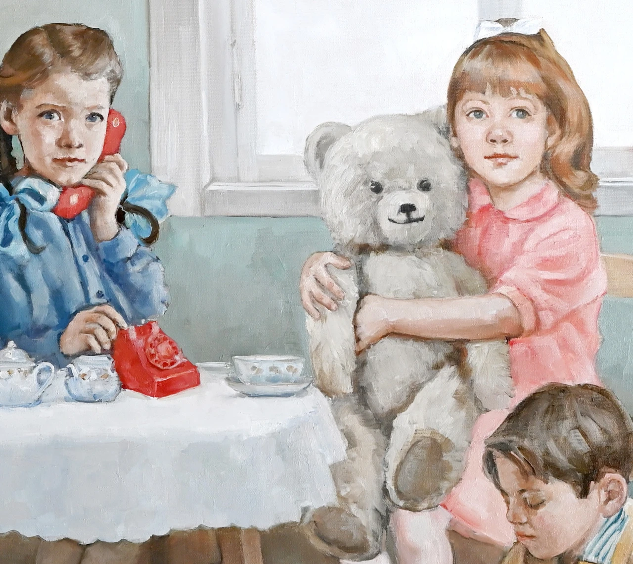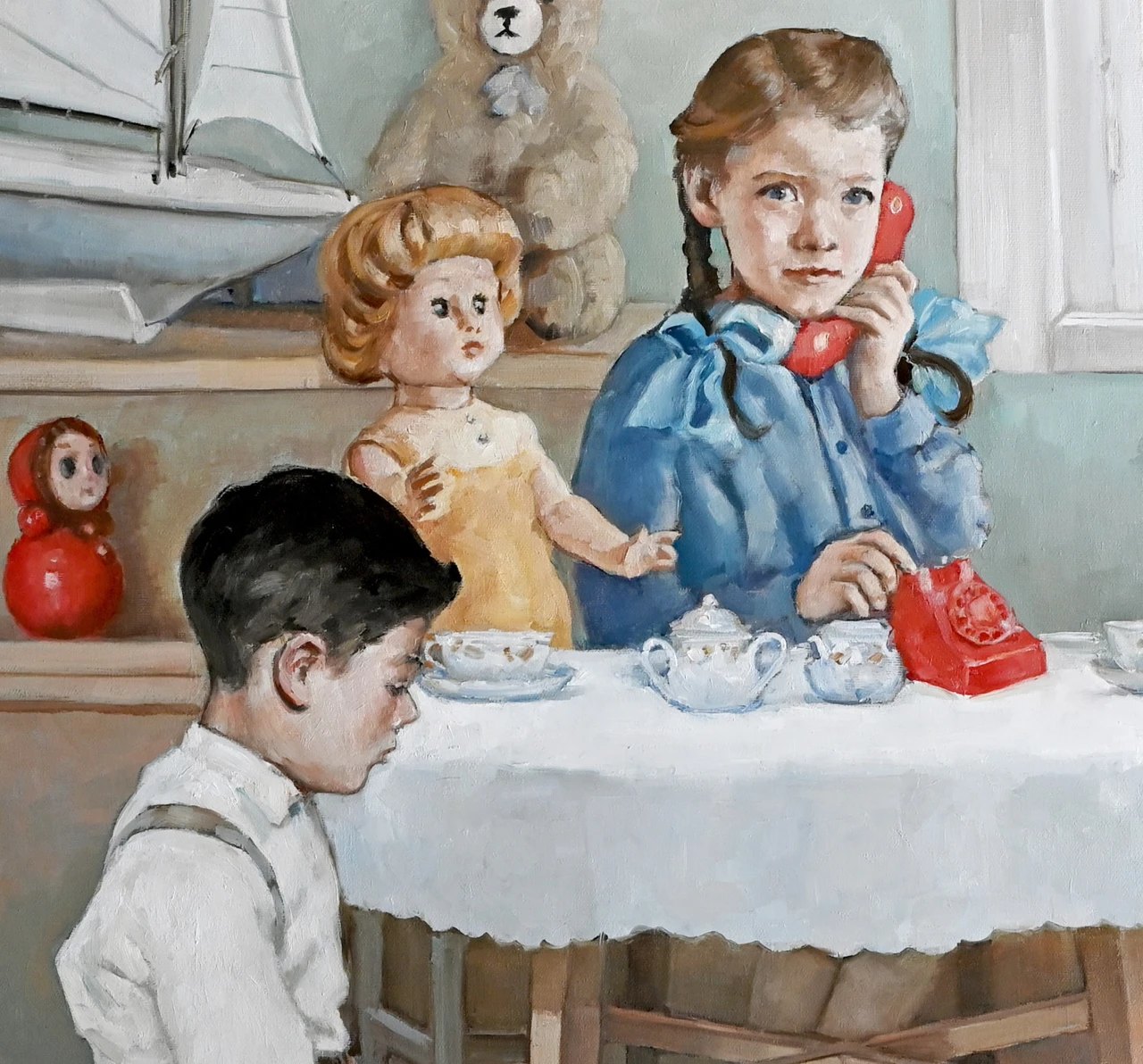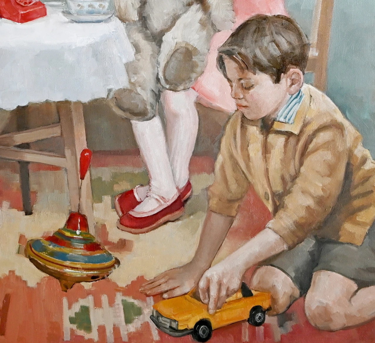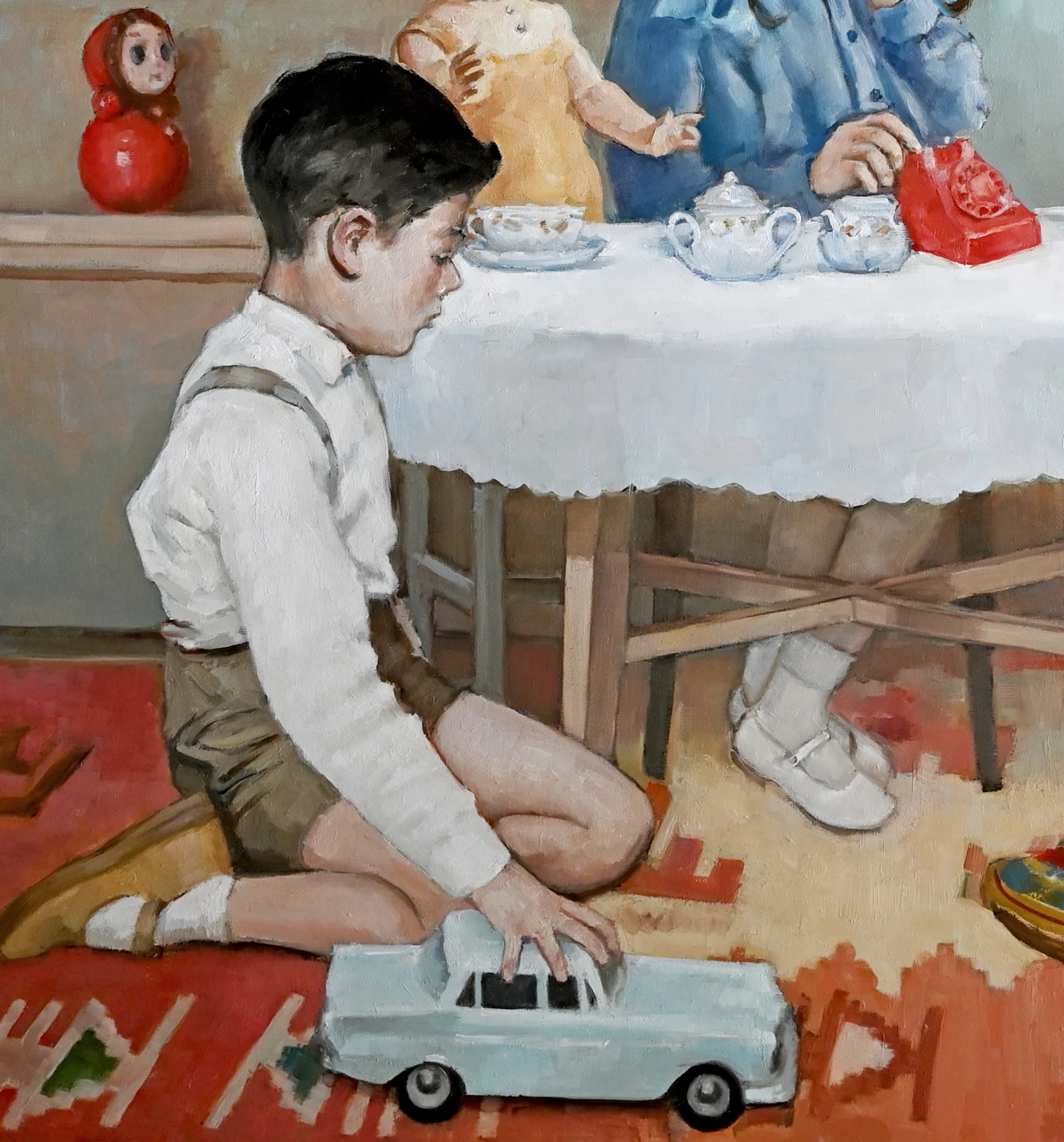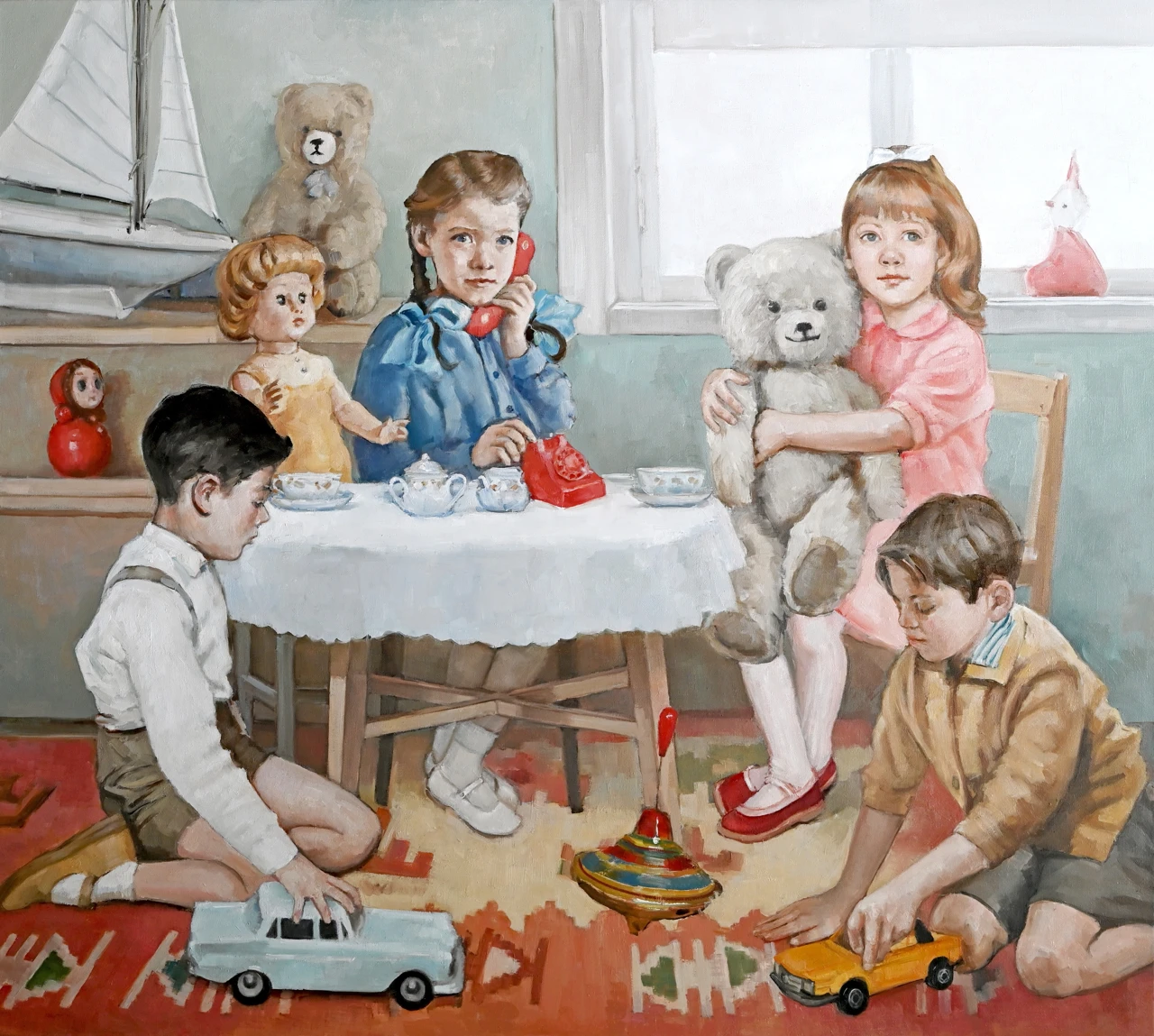 Работа «Нелинейная игра» представляет собой многофигурную живописную композицию, погружающую зрителя в пространство детской комнаты. Сюжет строится вокруг группы детей, окруженных классическими игрушками: от моделей машин и юлы до винтажных кукол и плюшевых медведей. Авторская работа мастерски передает атмосферу сосредоточенности и игры, где каждый персонаж занят своим делом, создавая сложный ритм взаимодействий. Мягкая, гармоничная палитра с преобладанием пастельных голубых, розовых и охристых тонов в сочетании с деликатной работой со светом придает полотну ностальгическое звучание. Современное искусство здесь обращается к теме преемственности поколений и эстетике ретро-образов. Детальная проработка фактур — от текстильной скатерти до гладкого пластика игрушечного телефона — подчеркивает осязаемость изображенного мира. Эта интерьерная живопись отличается выверенным композиционным равновесием, где крупные формы игрушек на заднем плане уравновешивают динамику детских фигур на ковре. Произведение станет выразительным арт-объектом для интерьера и ценным дополнением коллекции современного искусства.