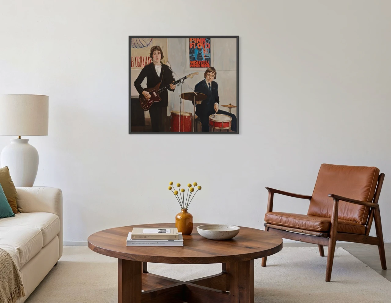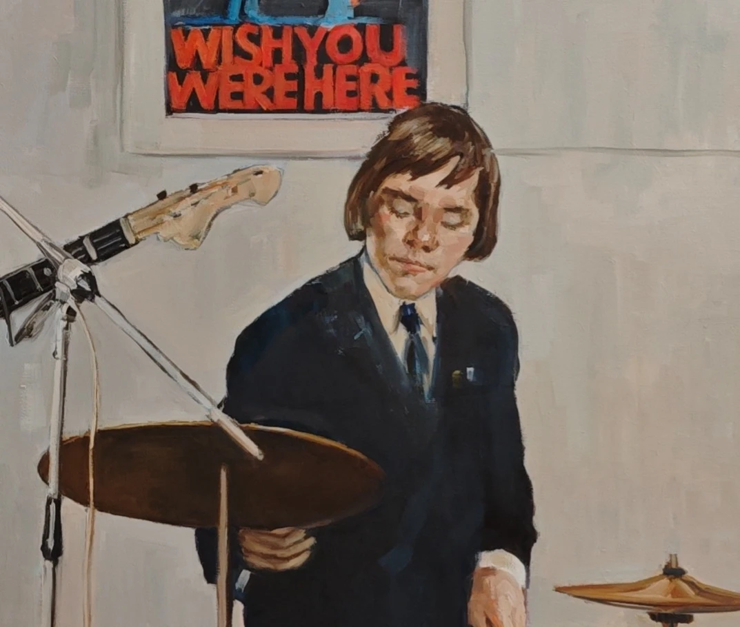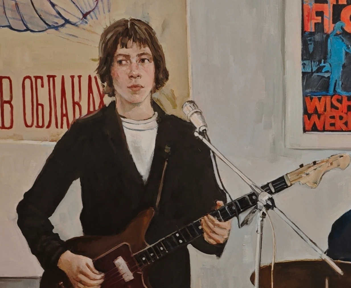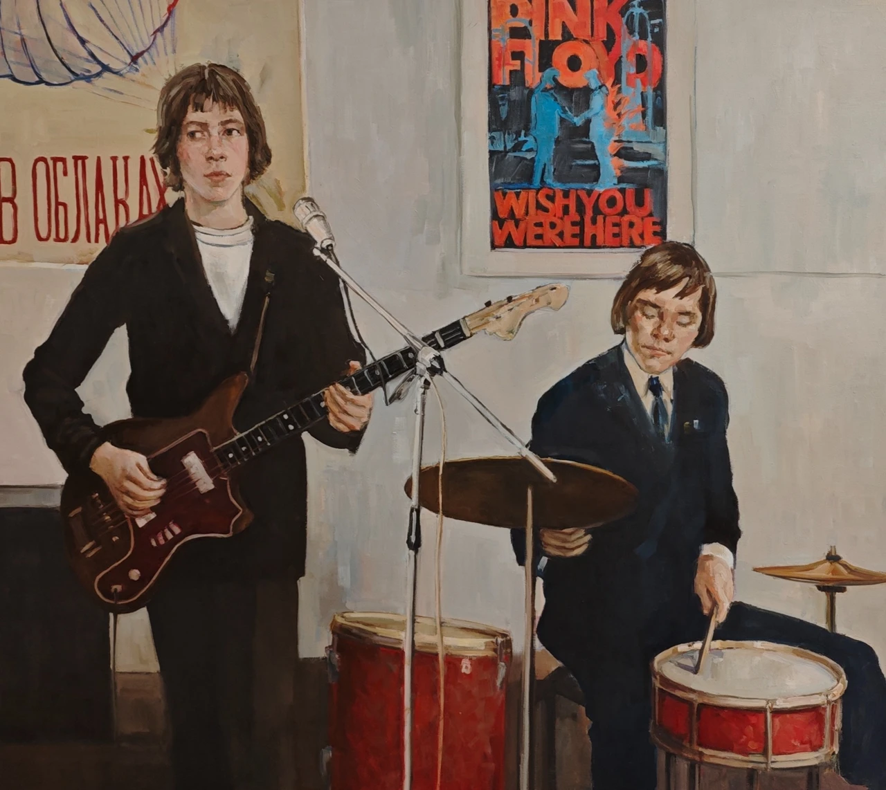 Работа «ВИА» — это сюжетная интерьерная живопись, погружающая зрителя в атмосферу репетиционного процесса молодежной музыкальной группы. В центре композиции запечатлены двое юношей: гитарист и барабанщик, чьи сосредоточенные позы и серьезные выражения лиц передают момент творческого поиска. Визуальный ряд дополнен характерными атрибутами эпохи — плакатом группы Pink Floyd и кириллическими надписями на заднем плане, что создает ностальгический контекст и подчеркивает связь поколений через музыку. Авторская работа выполнена маслом на холсте в сдержанной, гармоничной палитре с преобладанием охристых, серых и глубоких темных тонов, на фоне которых ярко выделяются красные акценты музыкальных инструментов. Уверенный мазок и мягкая работа со светом придают сцене осязаемость и глубину, превращая бытовой сюжет в значимый художественный образ. Это современное искусство мастерски балансирует между реализмом и экспрессией, сохраняя живость момента. Подобный арт-объект станет выразительным дополнением для частного или общественного интерьера, привнося в пространство интеллектуальный подтекст и эстетику ретро-культуры.