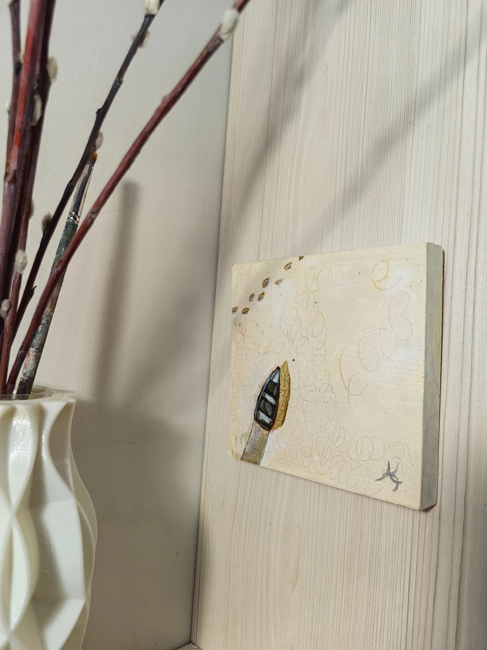 Спокойные тёплые оттенки помогают погрузиться в работу и зрительно проследить путь маленькой лодочки в большом белом пространстве.