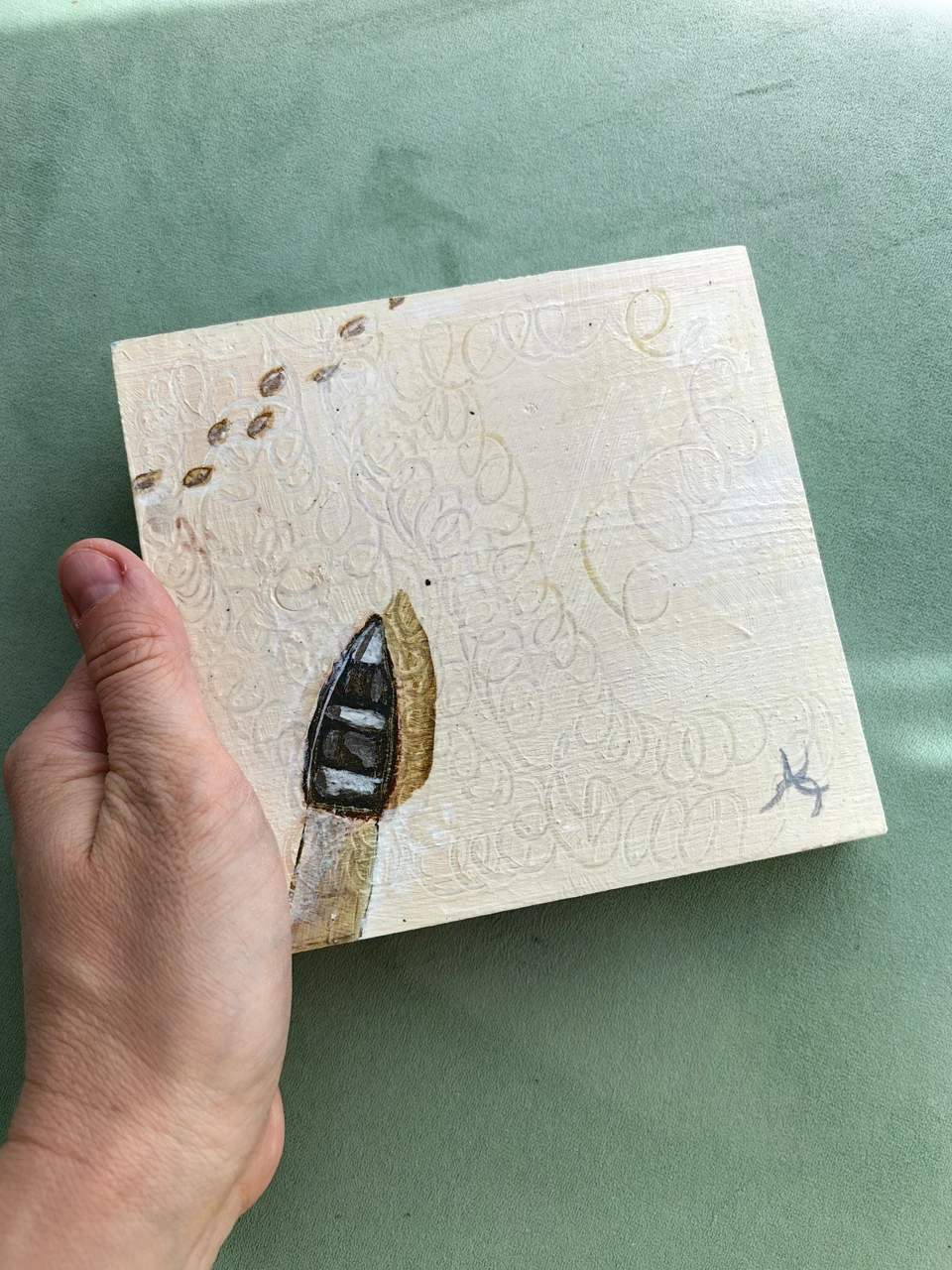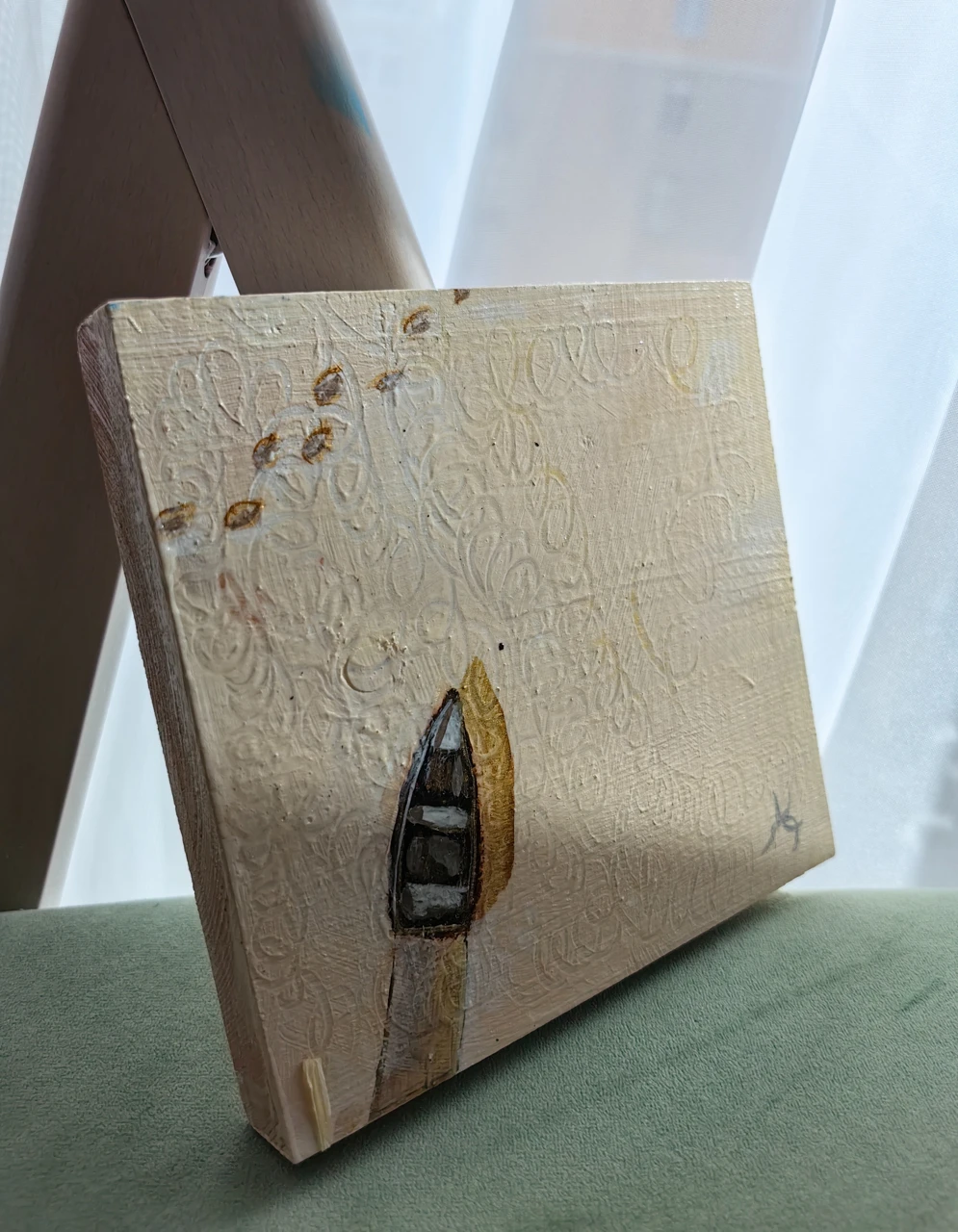 Перед вами выпиленный из дерева прямоугольник с изображенной на нём лодкой, идущей по светлой поверхности и оставляющей за собой след.
