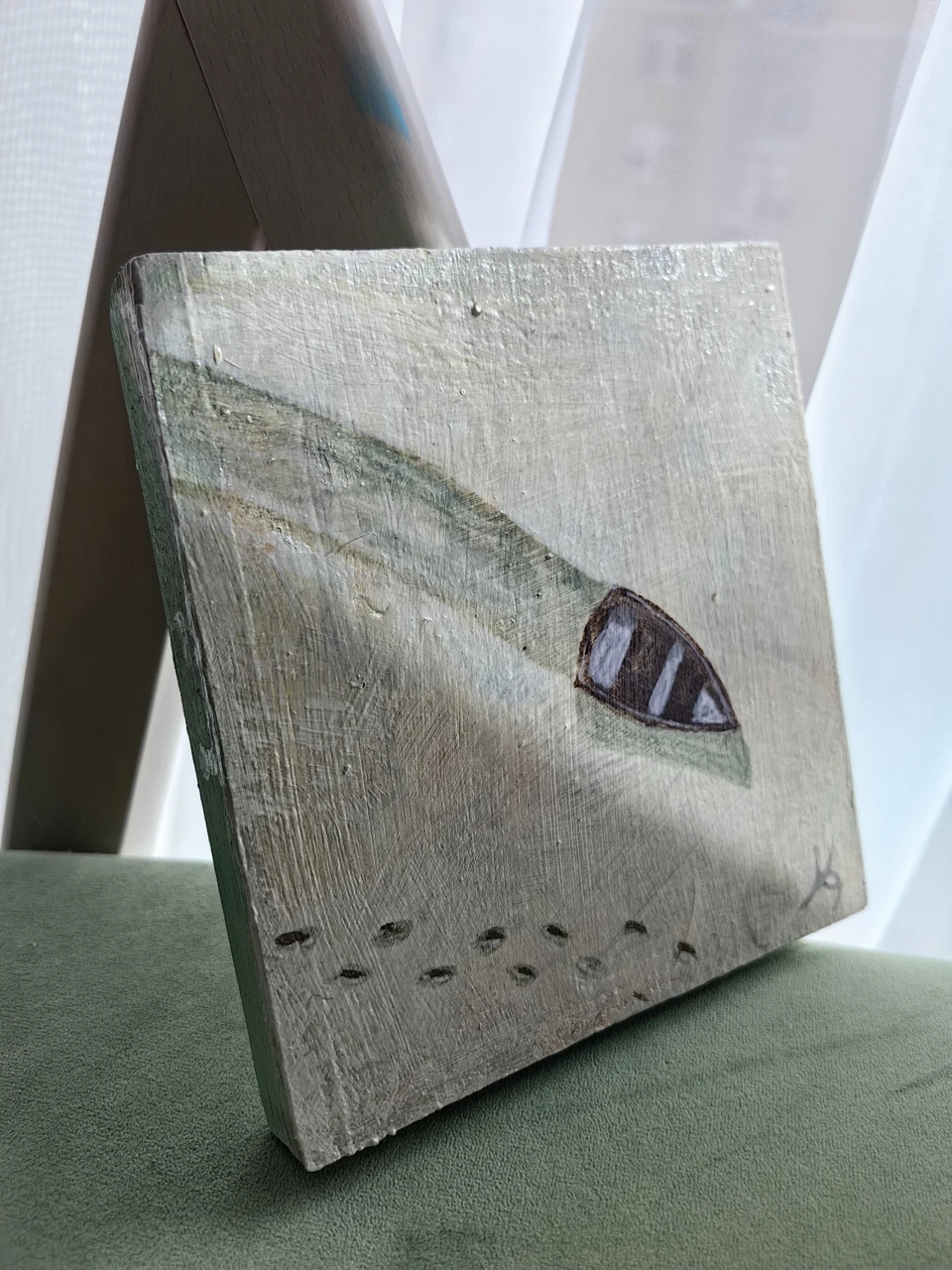 Перед вами выпиленный из дерева прямоугольник с изображенной на нём лодкой, идущей по светлой поверхности и оставляющей за собой след.