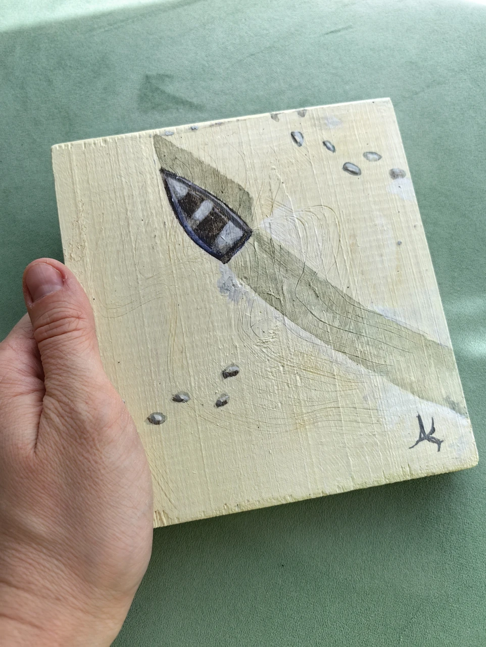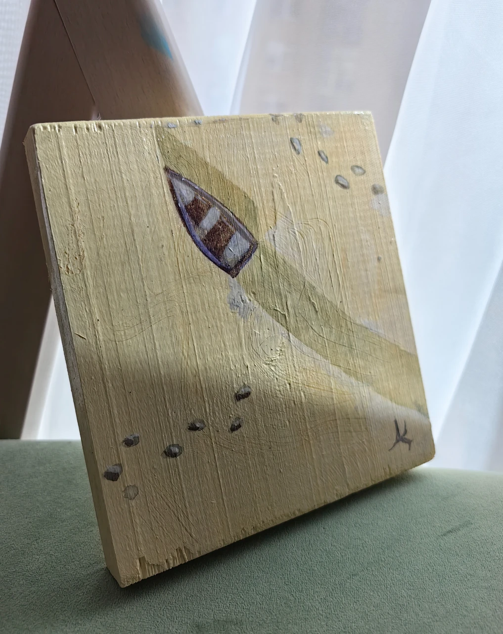 Перед вами выпиленный из дерева прямоугольник с изображенной на нём лодкой, идущей по светлой поверхности и оставляющей за собой след.