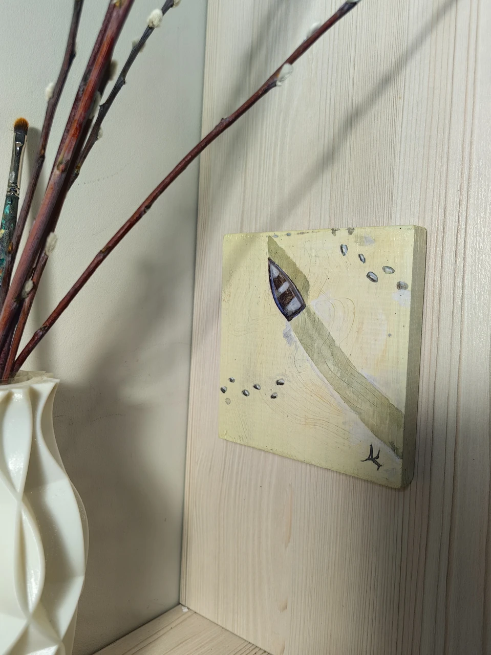 Спокойные тёплые оттенки помогают погрузиться в работу и зрительно проследить путь маленькой лодочки в большом белом пространстве.
