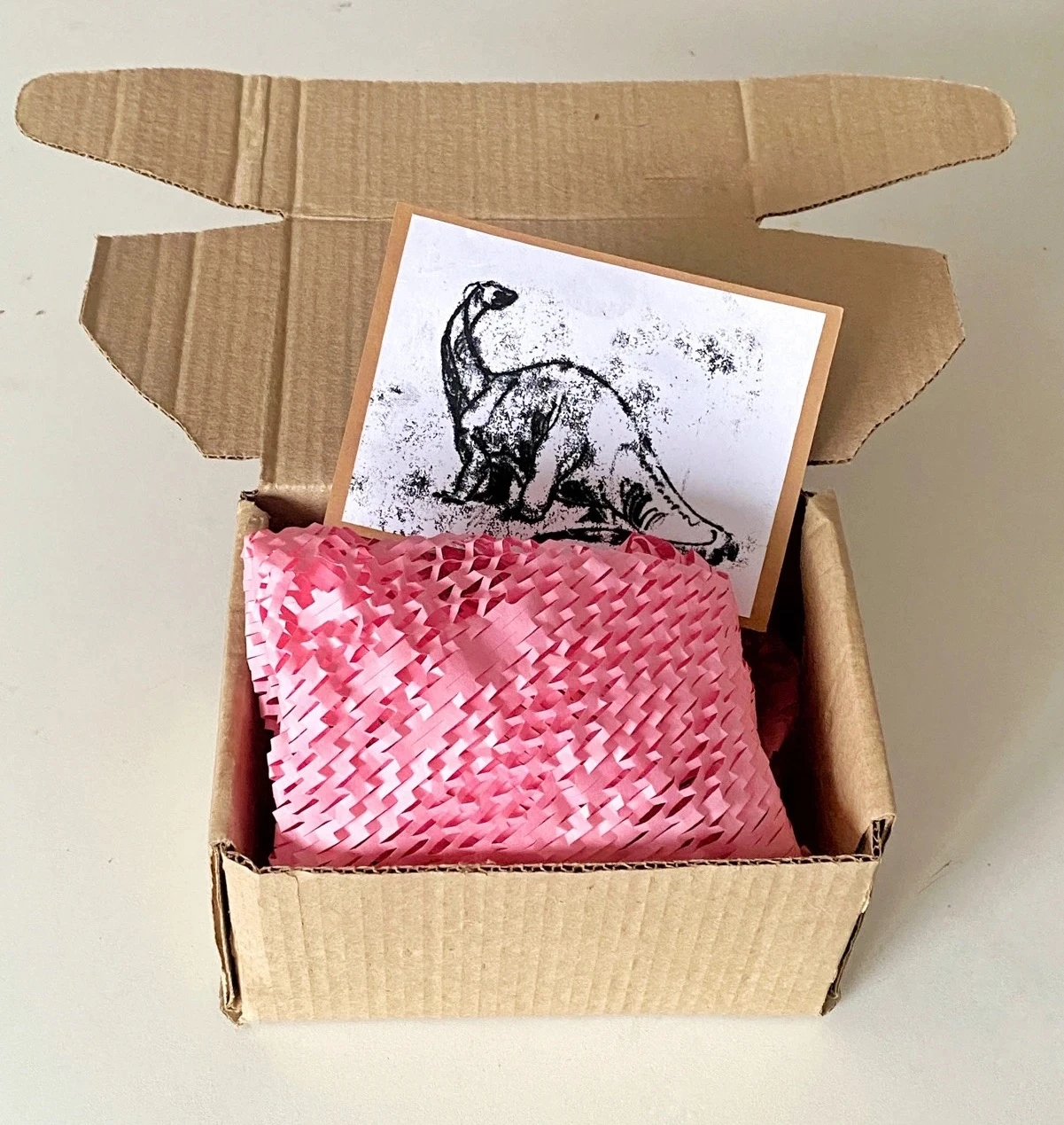 Подарочная упаковка, в подарок — открытка с ручной графикой (все открытки в единственном экземпляре, на них изображены разные динозавры). Бумага, картон, диатипия, размер около 10х15см.
